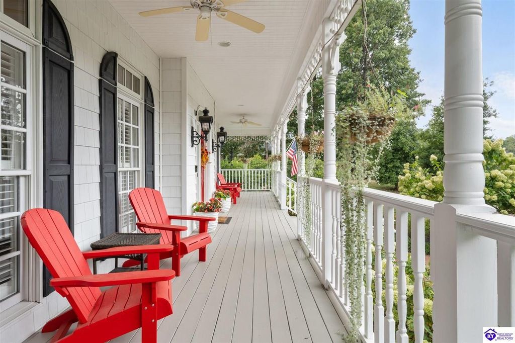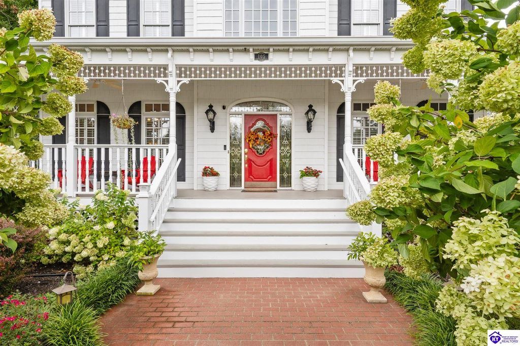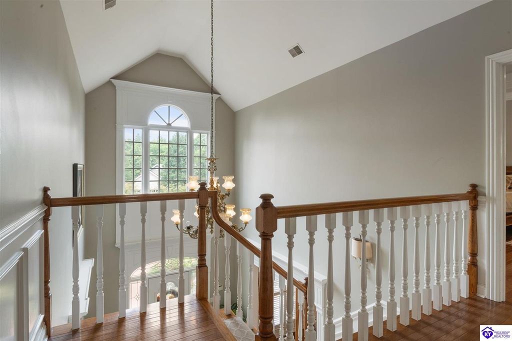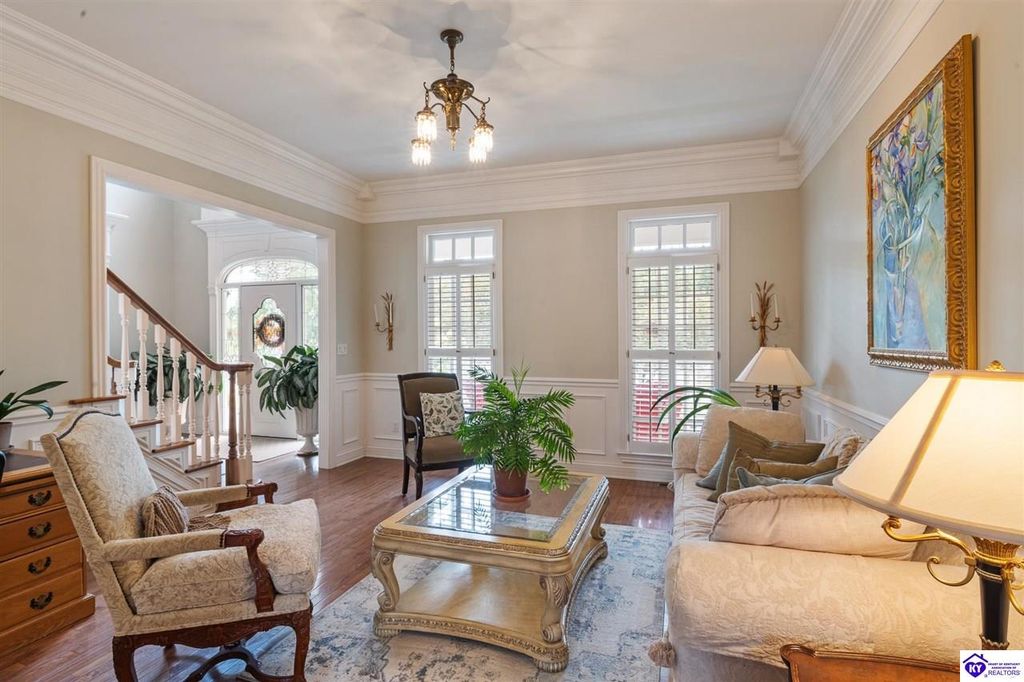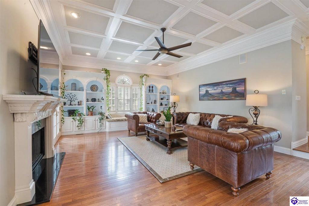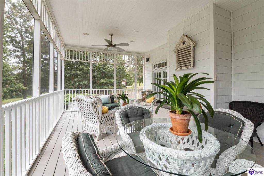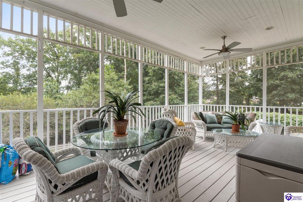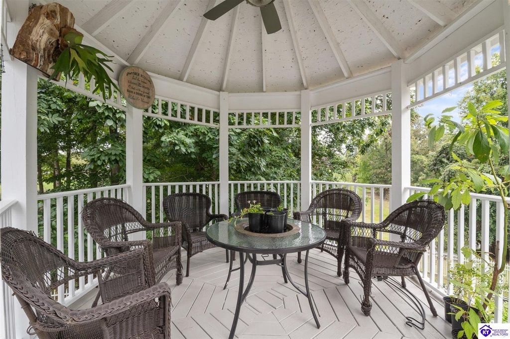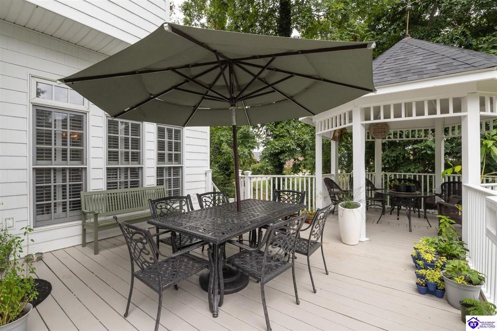 Southern Charm Meets Modern Luxury on Heartland Golf Course. Welcome to a show-stopping custom-built home where timeless Southern elegance and modern convenience blend seamlessly. Nestled on a meticulously landscaped lot overlooking the prestigious Heartland Golf Course, this stunning two-story residence boasts unparalleled curb appeal, complete with 3/4 wrap-around porches and grand double gazebos. Step inside the soaring two-story foyer and immediately feel this home's sophistication. The all-maple wood office with coffered ceilings sets the tone for refined living, while the open concept great room offers lighted built-ins, a cozy window bench, coffered ceilings and a fireplace - all flowing effortlessly onto the expansive back deck with screened porch and double-stacked gazebos for year-round enjoyment. The kitchen features a large island, breakfast bar, custom cabinets, stainless-steel appliances and floor to ceiling windows. The formal dining room opens to a charming front sitting room - perfect for entertaining. On the second level, the luxurious master retreat is a true sanctuary, featuring vaulted and beamed ceilings, hardwood floors, custom built-in bookcases/entertainment center, and a completely remodeled en-suite bath. Enjoy the spa-in spired bathroom, boasting a massive walk-in tiled shower, dual vanities, a two-person soaking tub, private water closet, and walk-in closet. Also on the 2nd level are two additional bedrooms (one with a fireplace), hardwood flooring, ceiling fans, double closets, and Jack & Jill bathroom with double vanities. The lower level includes a private in-law suite with its own kitchen, full bath, and living room. With direct access to the covered patio, lower gazebo, and gardens, this suite is ideal for guests or multi-generational living. Every detail of this home has been thoughtfully designed, from the plantation shutters and triple crown molding to the lush, fenced yard. This is not just a home - it's a lifestyle. YOUR rare opportunity to own one of the most beautiful properties in the area.