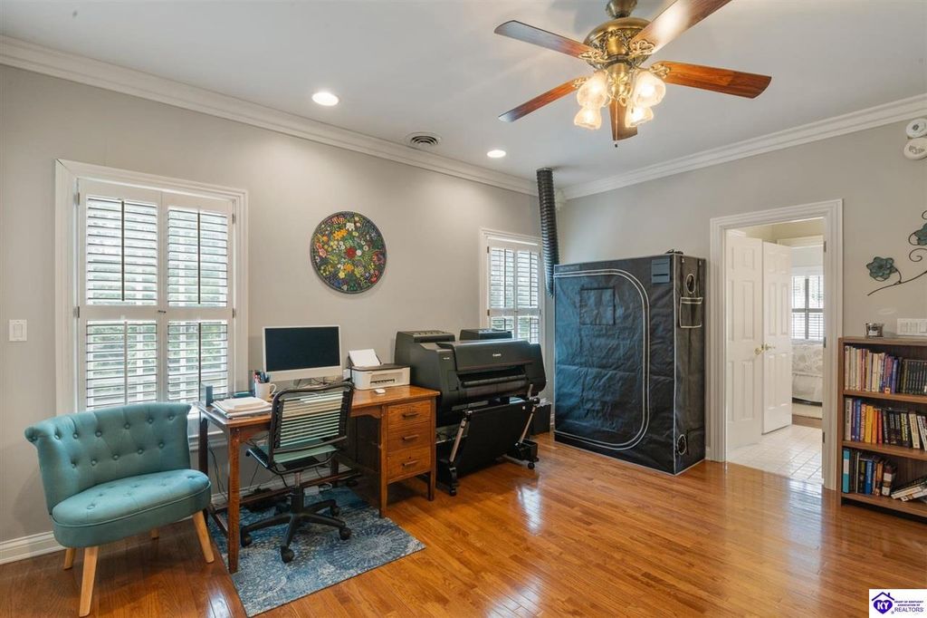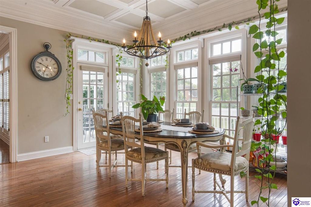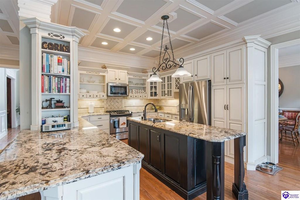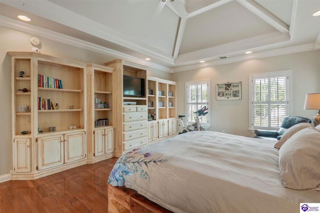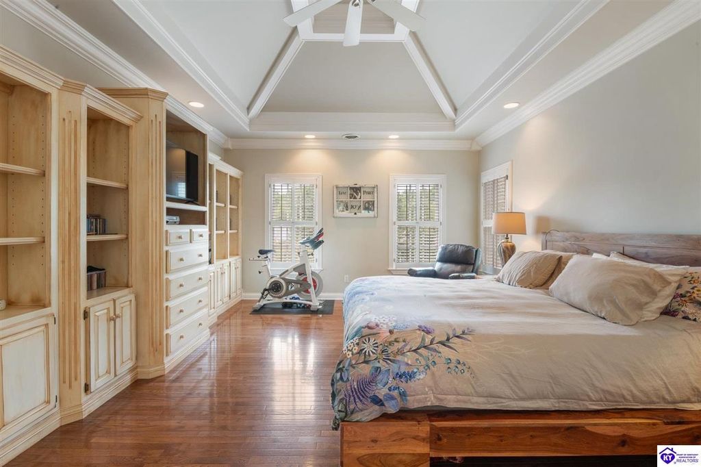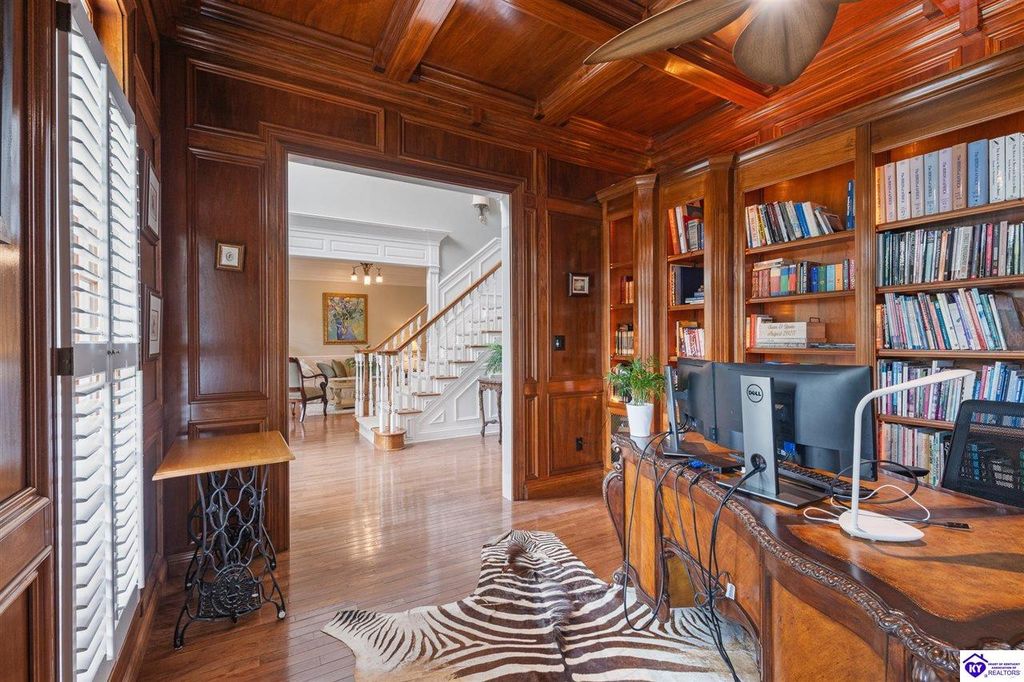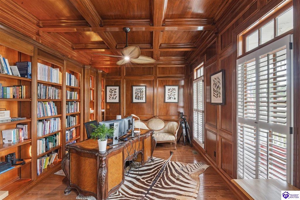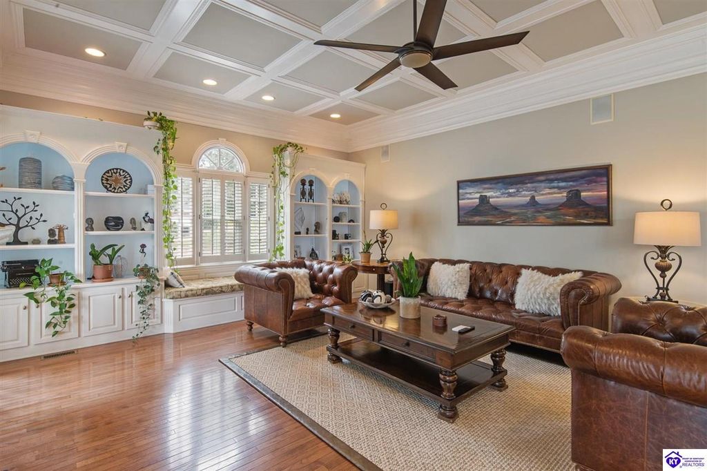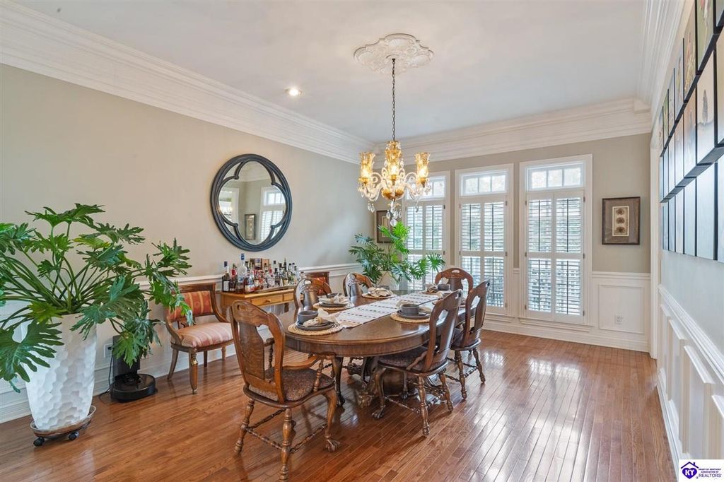 Southern Charm Meets Modern Luxury on Heartland Golf Course. Welcome to a show-stopping custom-built home where timeless Southern elegance and modern convenience blend seamlessly. Nestled on a meticulously landscaped lot overlooking the prestigious Heartland Golf Course, this stunning two-story residence boasts unparalleled curb appeal, complete with 3/4 wrap-around porches and grand double gazebos. Step inside the soaring two-story foyer and immediately feel this home's sophistication. The all-maple wood office with coffered ceilings sets the tone for refined living, while the open concept great room offers lighted built-ins, a cozy window bench, coffered ceilings and a fireplace - all flowing effortlessly onto the expansive back deck with screened porch and double-stacked gazebos for year-round enjoyment. The kitchen features a large island, breakfast bar, custom cabinets, stainless-steel appliances and floor to ceiling windows. The formal dining room opens to a charming front sitting room - perfect for entertaining. On the second level, the luxurious master retreat is a true sanctuary, featuring vaulted and beamed ceilings, hardwood floors, custom built-in bookcases/entertainment center, and a completely remodeled en-suite bath. Enjoy the spa-in spired bathroom, boasting a massive walk-in tiled shower, dual vanities, a two-person soaking tub, private water closet, and walk-in closet. Also on the 2nd level are two additional bedrooms (one with a fireplace), hardwood flooring, ceiling fans, double closets, and Jack & Jill bathroom with double vanities. The lower level includes a private in-law suite with its own kitchen, full bath, and living room. With direct access to the covered patio, lower gazebo, and gardens, this suite is ideal for guests or multi-generational living. Every detail of this home has been thoughtfully designed, from the plantation shutters and triple crown molding to the lush, fenced yard. This is not just a home - it's a lifestyle. YOUR rare opportunity to own one of the most beautiful properties in the area.