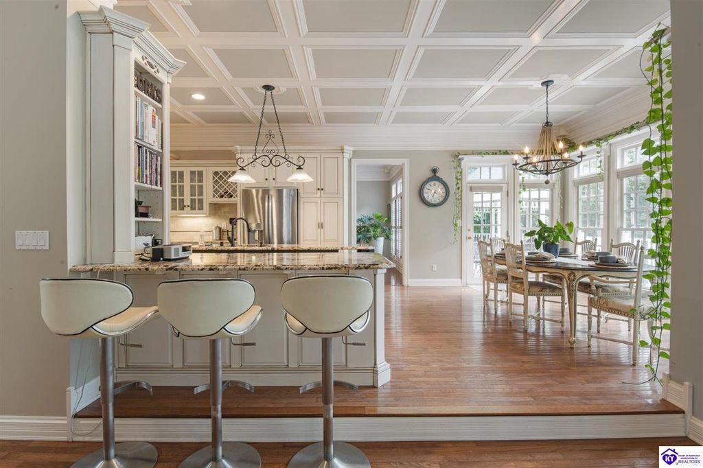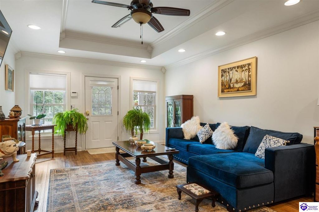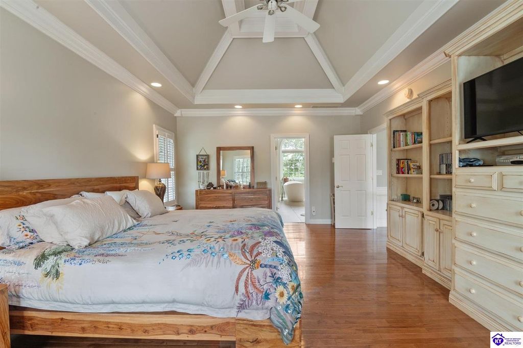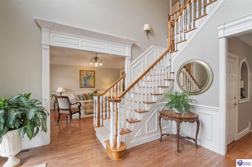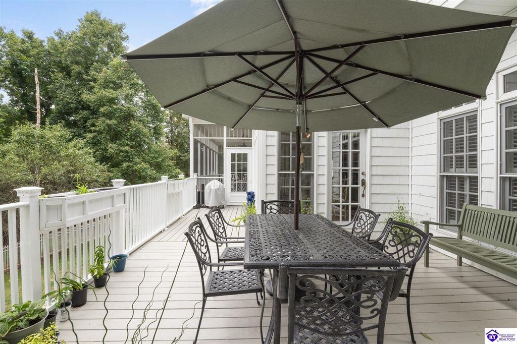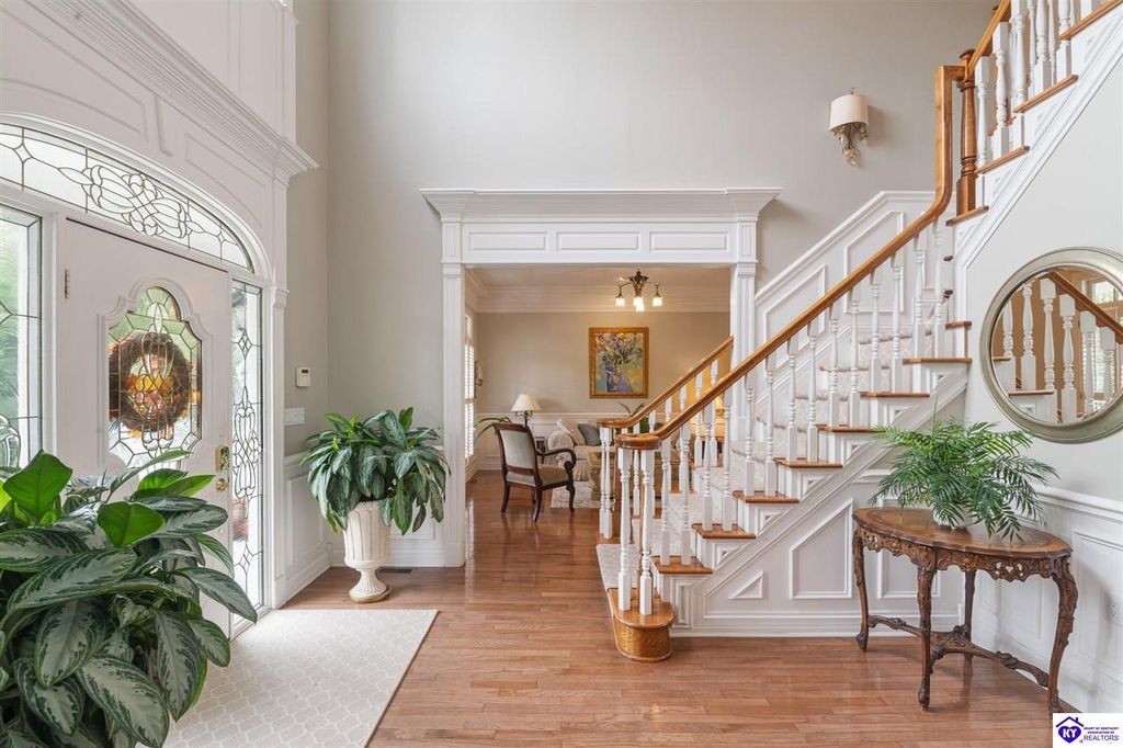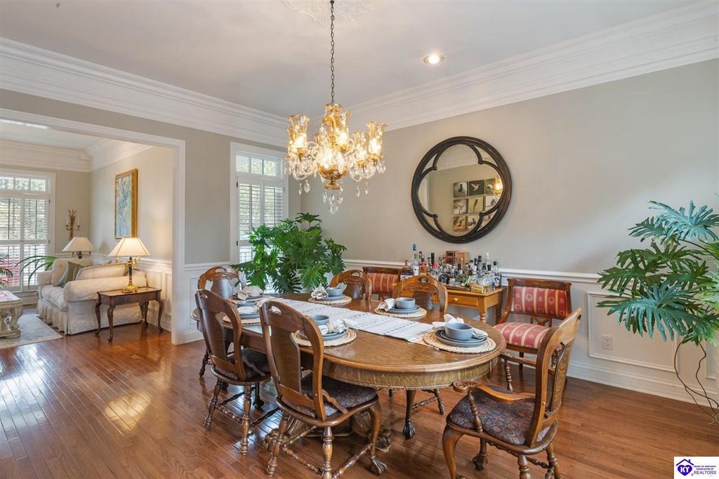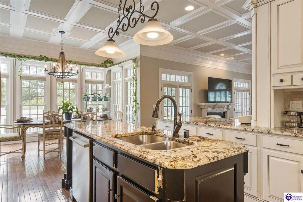 Southern Charm Meets Modern Luxury on Heartland Golf Course. Welcome to a show-stopping custom-built home where timeless Southern elegance and modern convenience blend seamlessly. Nestled on a meticulously landscaped lot overlooking the prestigious Heartland Golf Course, this stunning two-story residence boasts unparalleled curb appeal, complete with 3/4 wrap-around porches and grand double gazebos. Step inside the soaring two-story foyer and immediately feel this home's sophistication. The all-maple wood office with coffered ceilings sets the tone for refined living, while the open concept great room offers lighted built-ins, a cozy window bench, coffered ceilings and a fireplace - all flowing effortlessly onto the expansive back deck with screened porch and double-stacked gazebos for year-round enjoyment. The kitchen features a large island, breakfast bar, custom cabinets, stainless-steel appliances and floor to ceiling windows. The formal dining room opens to a charming front sitting room - perfect for entertaining. On the second level, the luxurious master retreat is a true sanctuary, featuring vaulted and beamed ceilings, hardwood floors, custom built-in bookcases/entertainment center, and a completely remodeled en-suite bath. Enjoy the spa-in spired bathroom, boasting a massive walk-in tiled shower, dual vanities, a two-person soaking tub, private water closet, and walk-in closet. Also on the 2nd level are two additional bedrooms (one with a fireplace), hardwood flooring, ceiling fans, double closets, and Jack & Jill bathroom with double vanities. The lower level includes a private in-law suite with its own kitchen, full bath, and living room. With direct access to the covered patio, lower gazebo, and gardens, this suite is ideal for guests or multi-generational living. Every detail of this home has been thoughtfully designed, from the plantation shutters and triple crown molding to the lush, fenced yard. This is not just a home - it's a lifestyle. YOUR rare opportunity to own one of the most beautiful properties in the area.