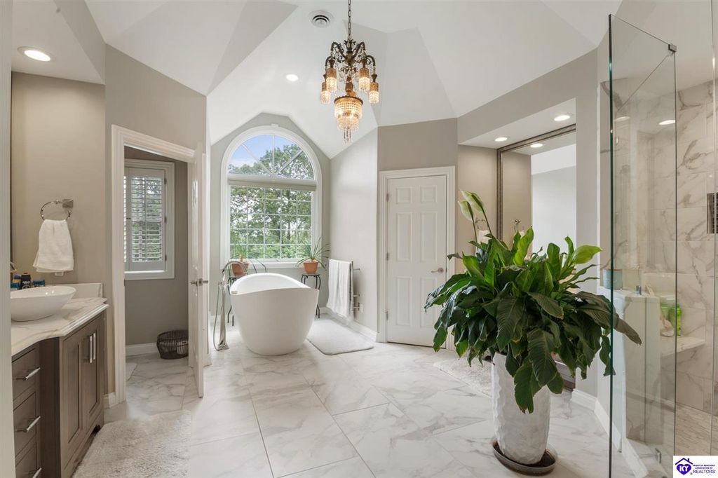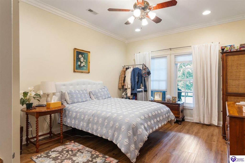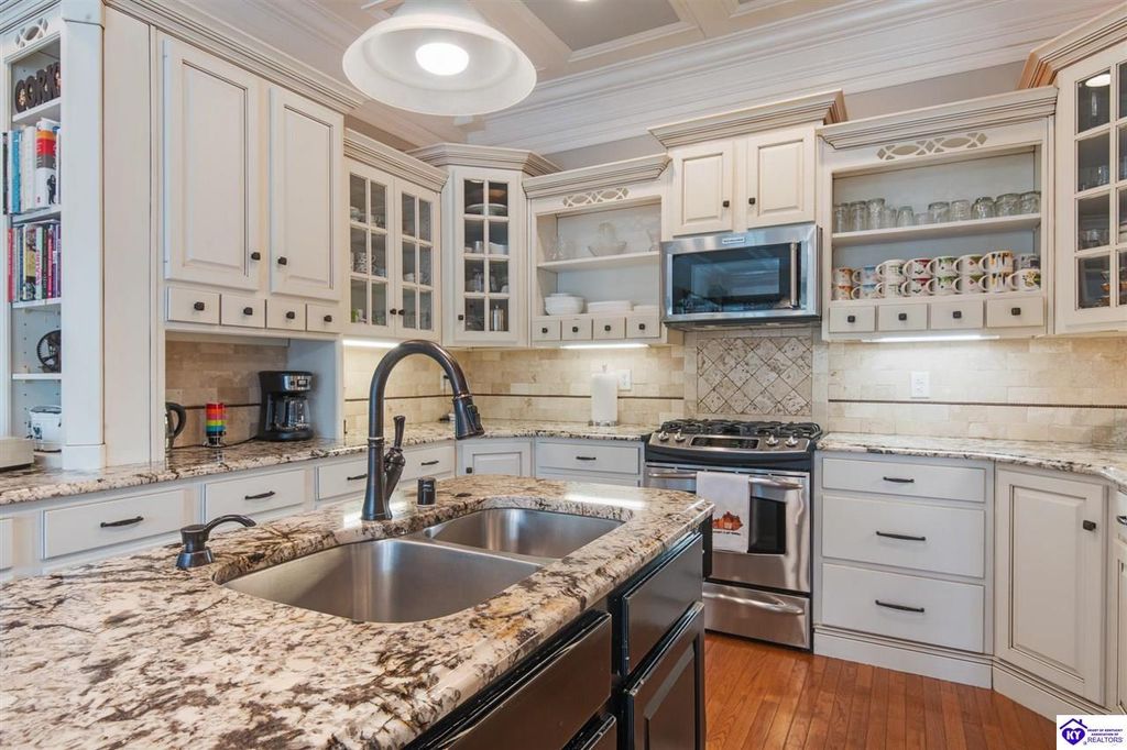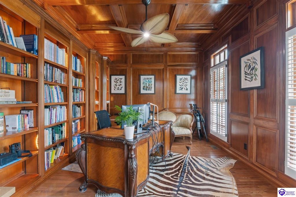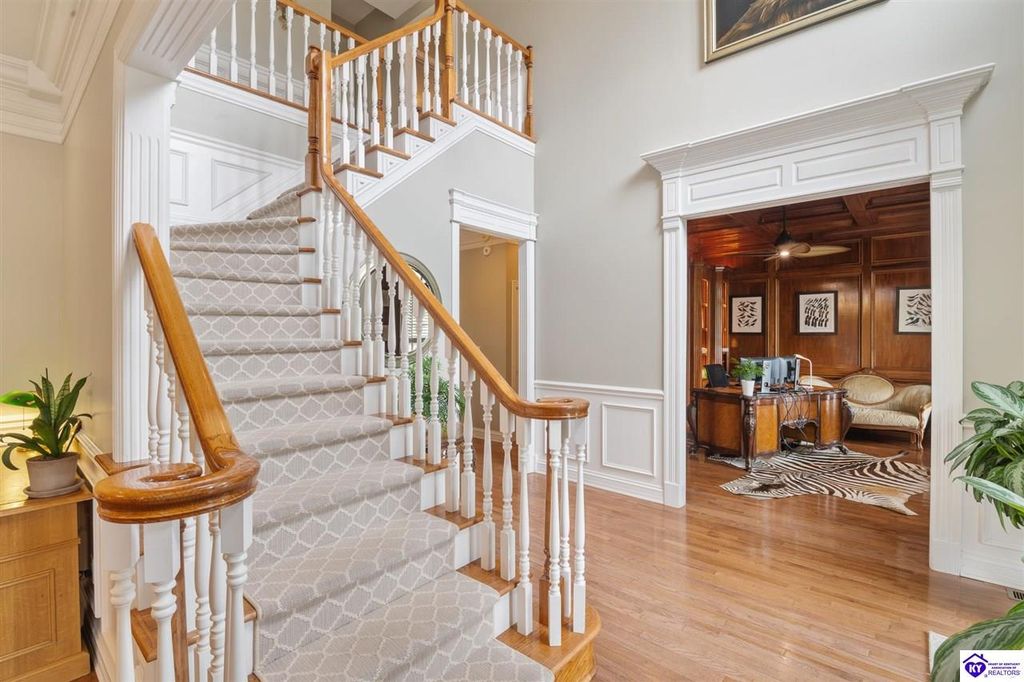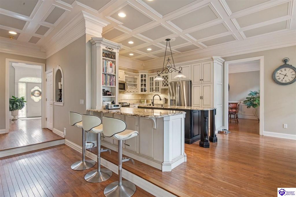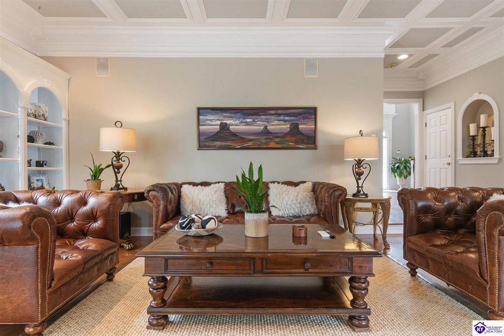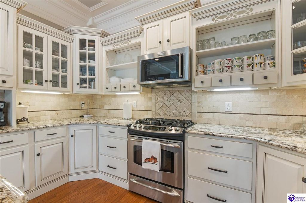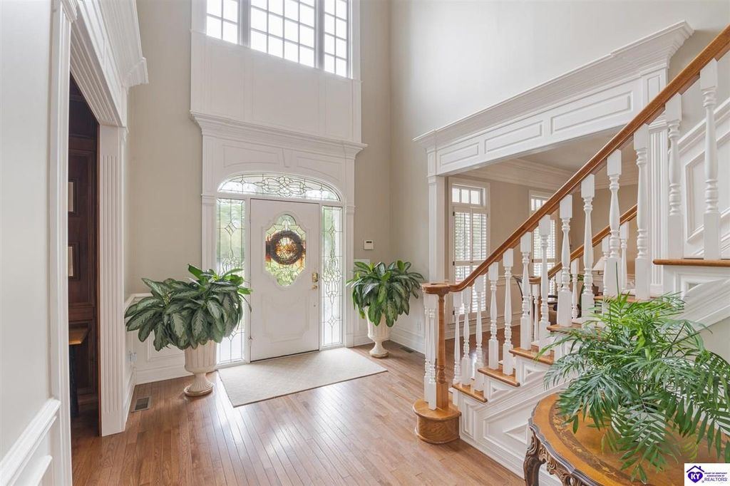 Southern Charm Meets Modern Luxury on Heartland Golf Course. Welcome to a show-stopping custom-built home where timeless Southern elegance and modern convenience blend seamlessly. Nestled on a meticulously landscaped lot overlooking the prestigious Heartland Golf Course, this stunning two-story residence boasts unparalleled curb appeal, complete with 3/4 wrap-around porches and grand double gazebos. Step inside the soaring two-story foyer and immediately feel this home's sophistication. The all-maple wood office with coffered ceilings sets the tone for refined living, while the open concept great room offers lighted built-ins, a cozy window bench, coffered ceilings and a fireplace - all flowing effortlessly onto the expansive back deck with screened porch and double-stacked gazebos for year-round enjoyment. The kitchen features a large island, breakfast bar, custom cabinets, stainless-steel appliances and floor to ceiling windows. The formal dining room opens to a charming front sitting room - perfect for entertaining. On the second level, the luxurious master retreat is a true sanctuary, featuring vaulted and beamed ceilings, hardwood floors, custom built-in bookcases/entertainment center, and a completely remodeled en-suite bath. Enjoy the spa-in spired bathroom, boasting a massive walk-in tiled shower, dual vanities, a two-person soaking tub, private water closet, and walk-in closet. Also on the 2nd level are two additional bedrooms (one with a fireplace), hardwood flooring, ceiling fans, double closets, and Jack & Jill bathroom with double vanities. The lower level includes a private in-law suite with its own kitchen, full bath, and living room. With direct access to the covered patio, lower gazebo, and gardens, this suite is ideal for guests or multi-generational living. Every detail of this home has been thoughtfully designed, from the plantation shutters and triple crown molding to the lush, fenced yard. This is not just a home - it's a lifestyle. YOUR rare opportunity to own one of the most beautiful properties in the area.