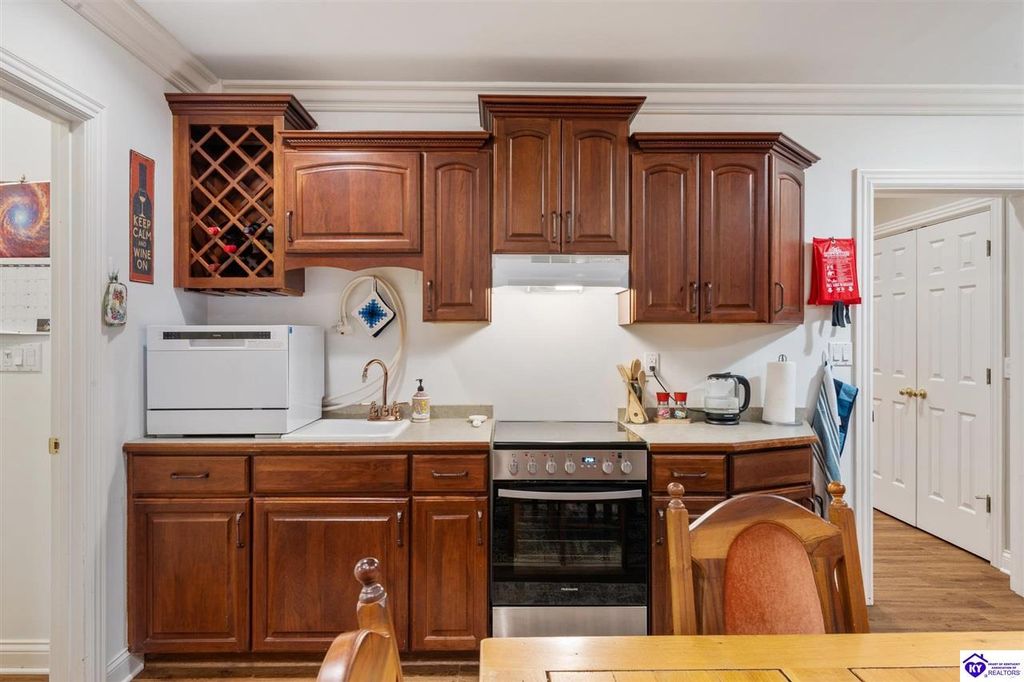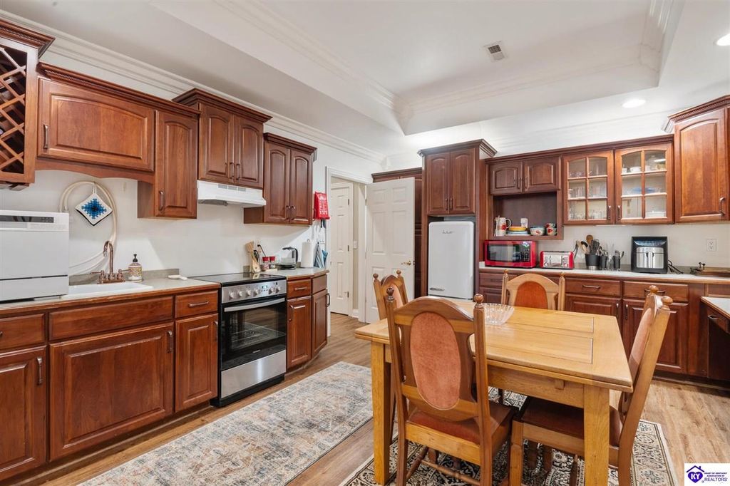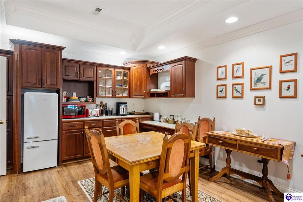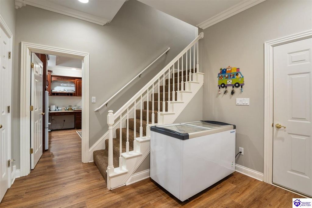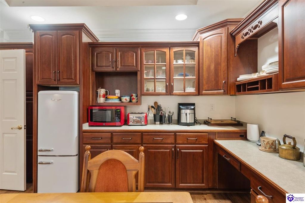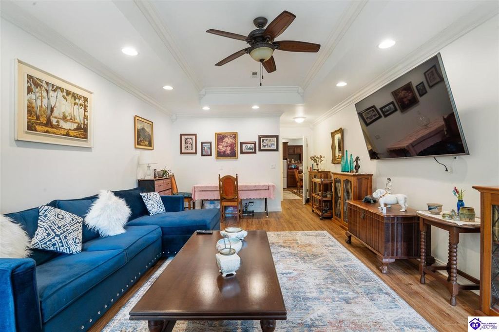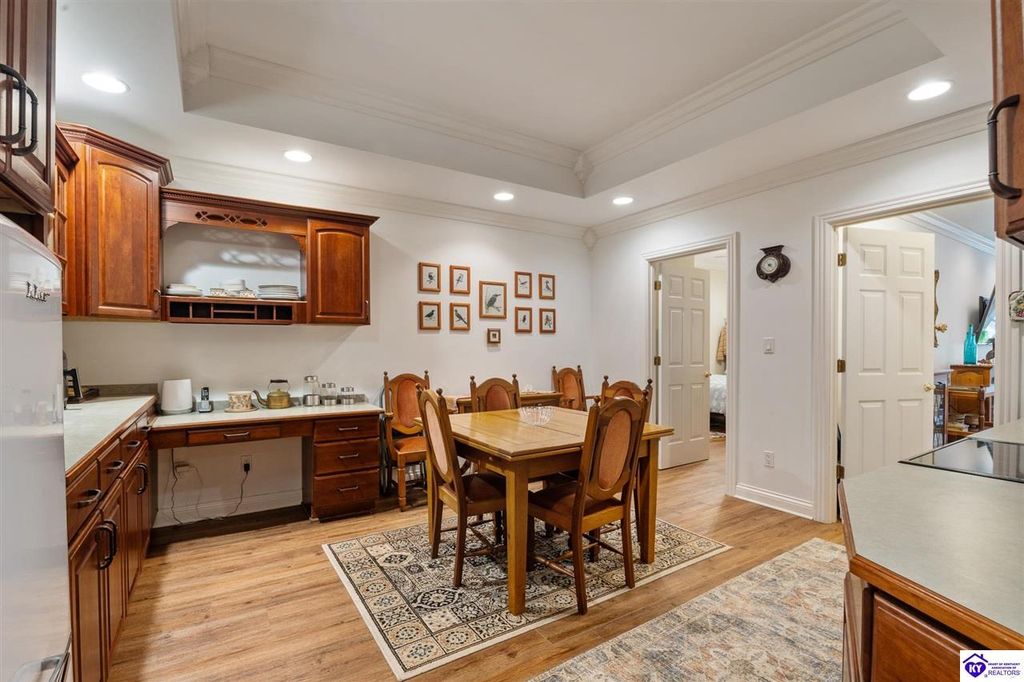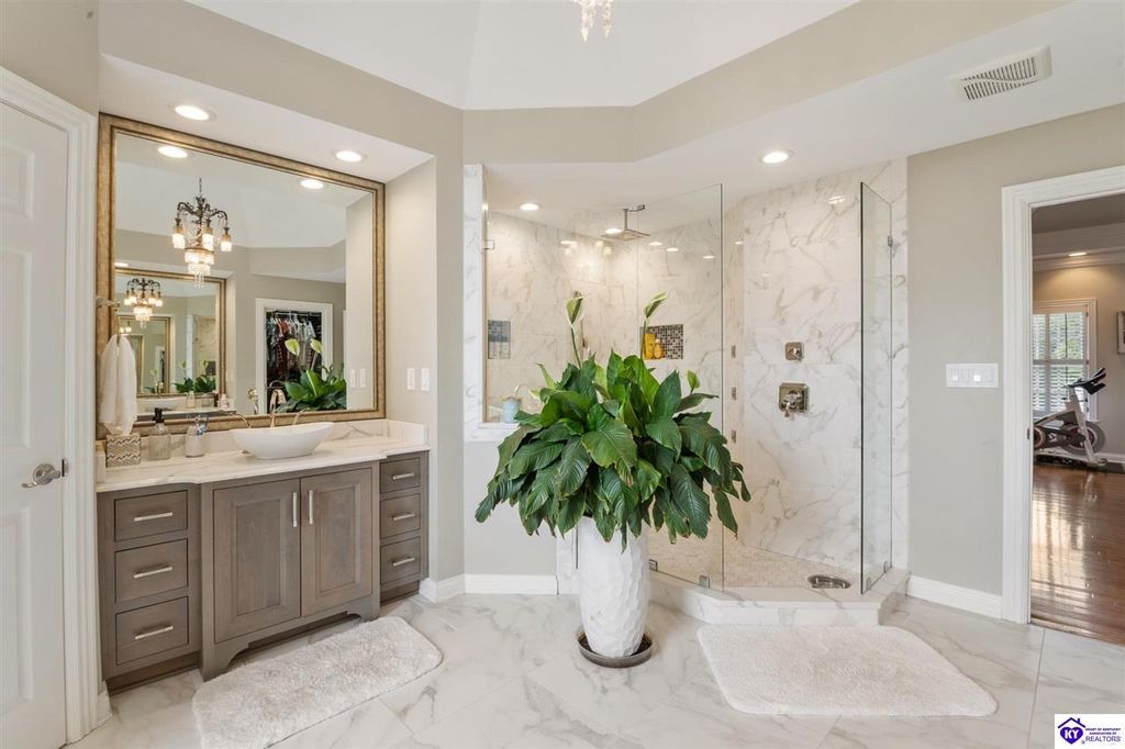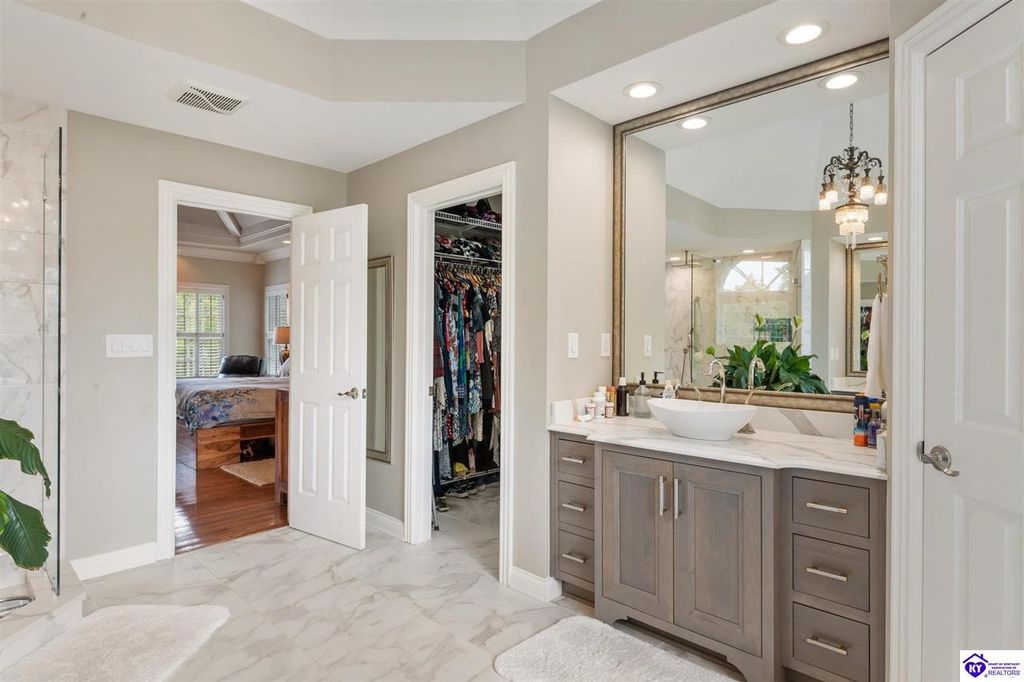 Southern Charm Meets Modern Luxury on Heartland Golf Course. Welcome to a show-stopping custom-built home where timeless Southern elegance and modern convenience blend seamlessly. Nestled on a meticulously landscaped lot overlooking the prestigious Heartland Golf Course, this stunning two-story residence boasts unparalleled curb appeal, complete with 3/4 wrap-around porches and grand double gazebos. Step inside the soaring two-story foyer and immediately feel this home's sophistication. The all-maple wood office with coffered ceilings sets the tone for refined living, while the open concept great room offers lighted built-ins, a cozy window bench, coffered ceilings and a fireplace - all flowing effortlessly onto the expansive back deck with screened porch and double-stacked gazebos for year-round enjoyment. The kitchen features a large island, breakfast bar, custom cabinets, stainless-steel appliances and floor to ceiling windows. The formal dining room opens to a charming front sitting room - perfect for entertaining. On the second level, the luxurious master retreat is a true sanctuary, featuring vaulted and beamed ceilings, hardwood floors, custom built-in bookcases/entertainment center, and a completely remodeled en-suite bath. Enjoy the spa-in spired bathroom, boasting a massive walk-in tiled shower, dual vanities, a two-person soaking tub, private water closet, and walk-in closet. Also on the 2nd level are two additional bedrooms (one with a fireplace), hardwood flooring, ceiling fans, double closets, and Jack & Jill bathroom with double vanities. The lower level includes a private in-law suite with its own kitchen, full bath, and living room. With direct access to the covered patio, lower gazebo, and gardens, this suite is ideal for guests or multi-generational living. Every detail of this home has been thoughtfully designed, from the plantation shutters and triple crown molding to the lush, fenced yard. This is not just a home - it's a lifestyle. YOUR rare opportunity to own one of the most beautiful properties in the area.