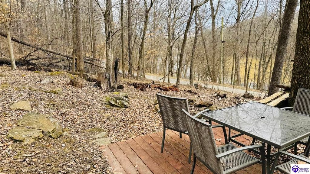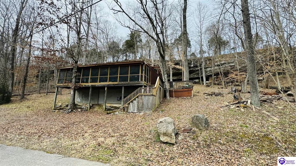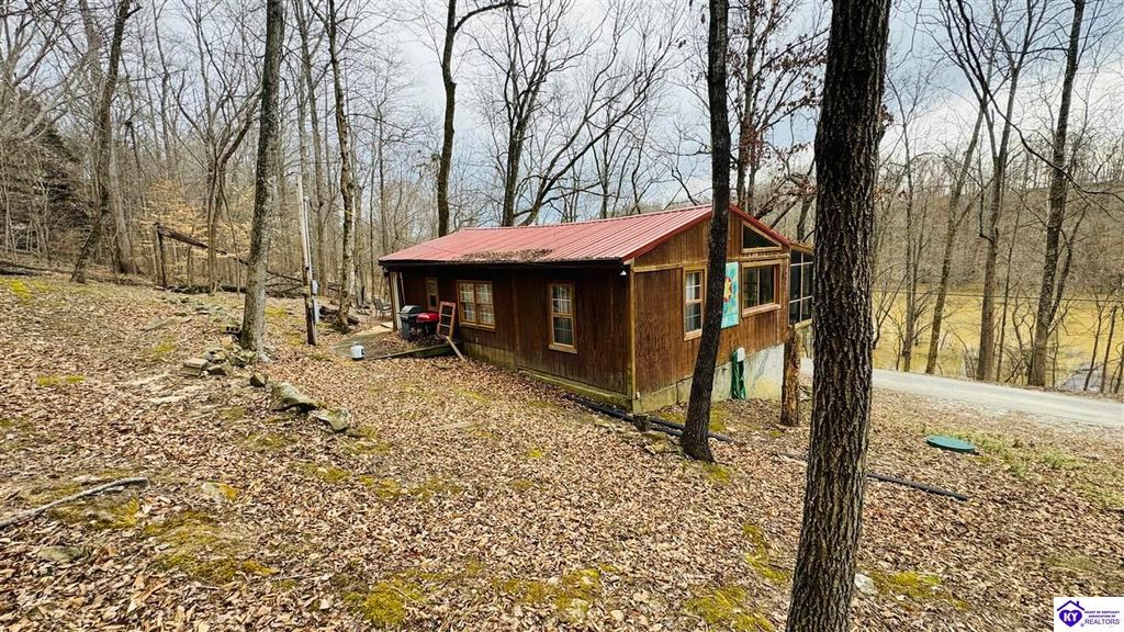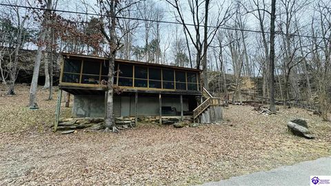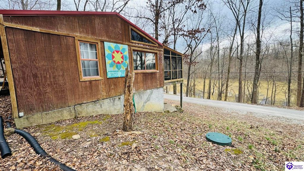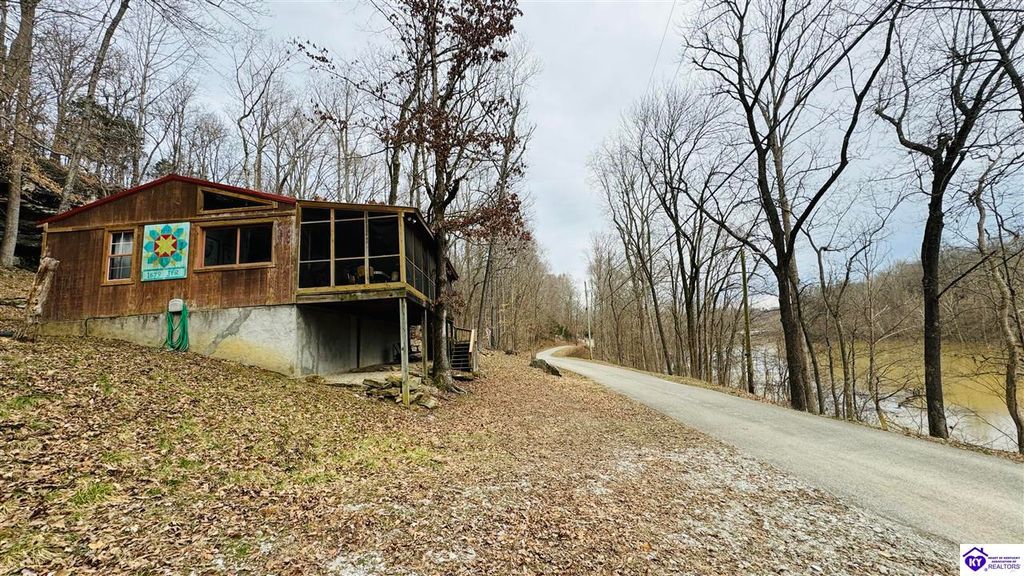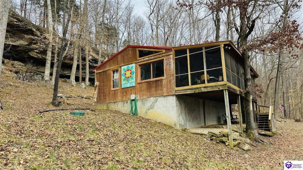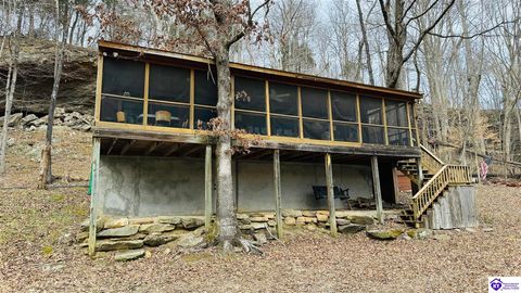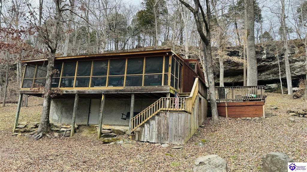 Sitting on two lakefront lots, this charming 2 bedroom, 1 bath cabin with a loft is the perfect lake getaway! Enjoy your mornings or evenings on the spacious screened-in porch, where you can relax and take in the peaceful lake views. Towering cliffs provide a stunning backdrop for nights gathered around the campfire. An existing dock (transferable with COE approval) makes lake access a breeze, and there's plenty of parking for friends and family. This cozy cottage on Rough River Lake is the perfect blend of relaxation and adventure. You truly have to see it in person to appreciate all it has to offer!