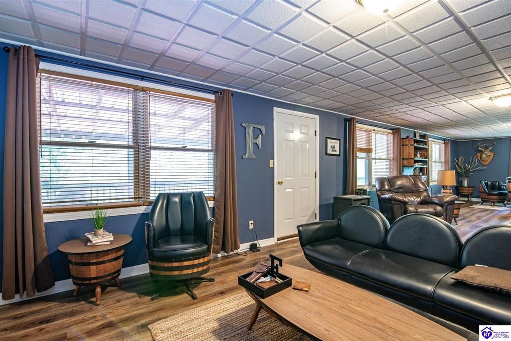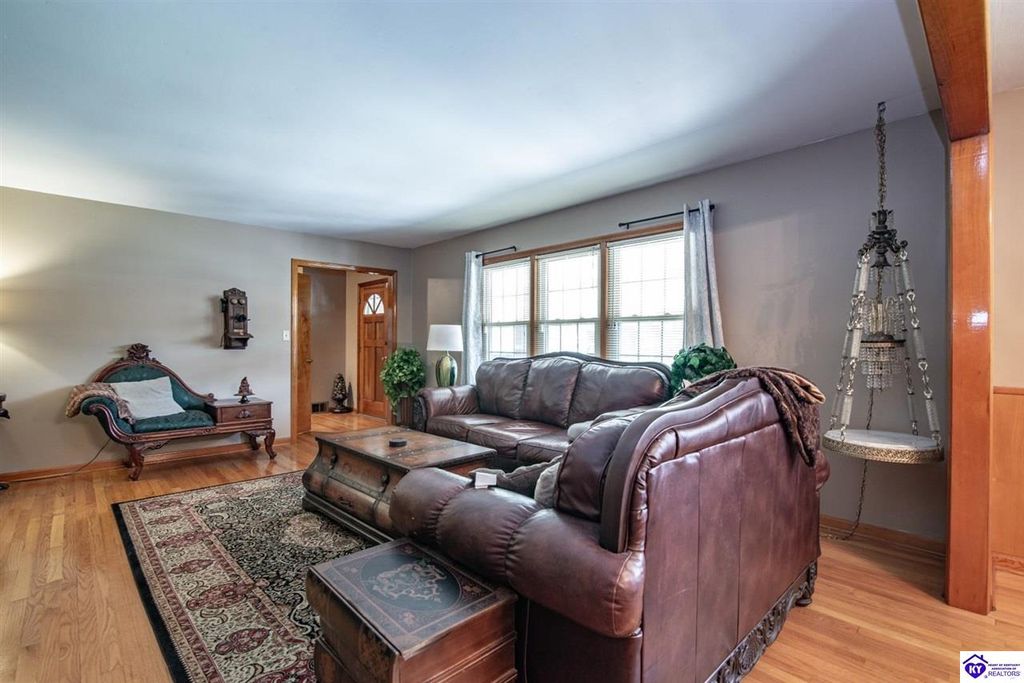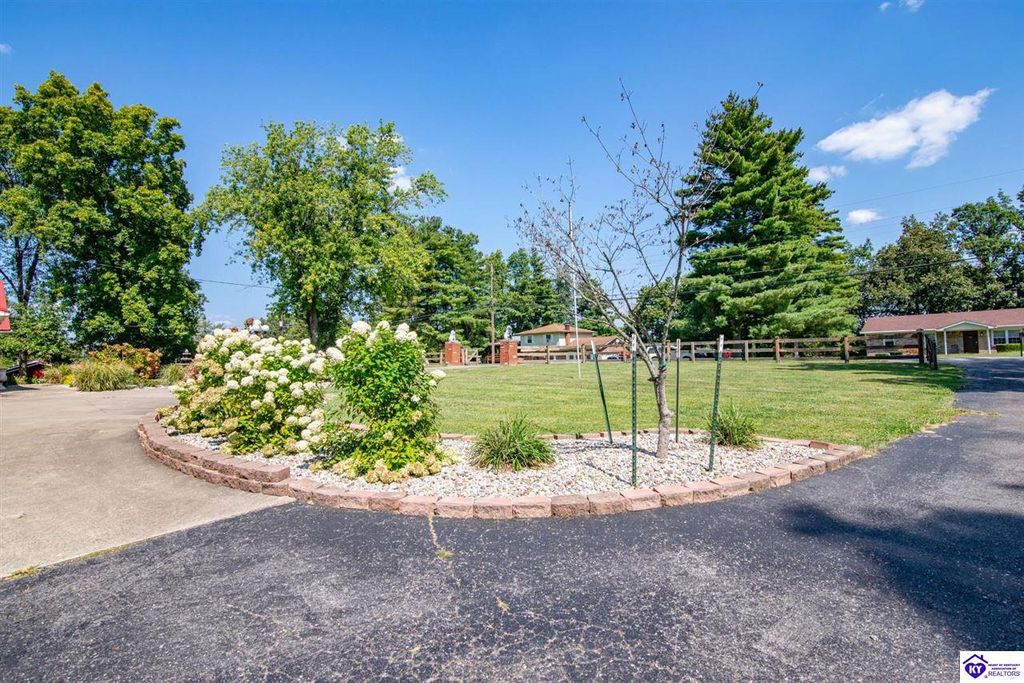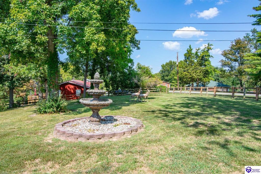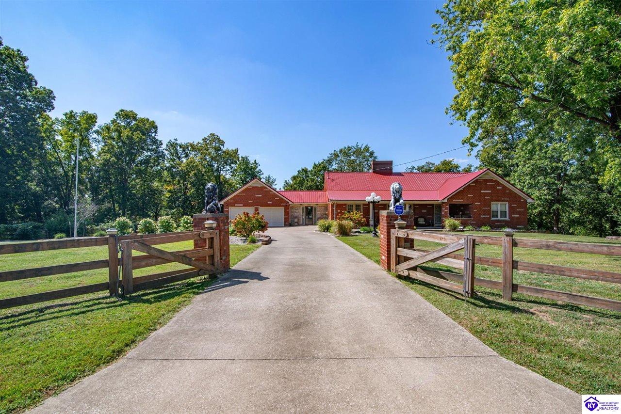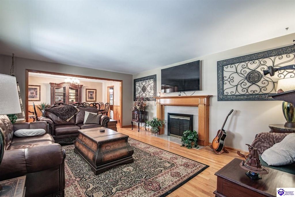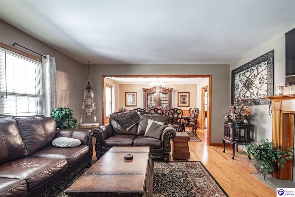 Unbelievable price! As you pull into the circular driveway with board fencing, you will love the stylish and updated landscaping that adds both functionality and curb appeal! This exceptional six-bedroom, three-bathroom home is where spacious living meets a thoughtful design in a park-like setting. This impressive home offers an abundance of square footage with five generous family gathering areas, ensuring everyone has their perfect space to relax and connect. The heart of the home features an oversized kitchen complete with a full appliance package and a charming fireplace that makes meal preparation feel like a cozy gathering. You'll discover beautiful hardwood flooring throughout select rooms, adding warmth and character to the living spaces. The main level conveniently houses two bedrooms, while additional bedrooms provide flexible options for family, guests, or home offices. Three fireplaces throughout the home create inviting focal points in the kitchen, living room, and recreation room, perfect for those cooler Kentucky evenings. The finished walkout basement also offers additional family space for movie night or family gatherings. Step outside to enjoy the covered front porch and expansive covered deck overlooking your private backyard retreat. Car enthusiasts will appreciate the impressive garage space accommodating up to 6 vehicles, complemented by large storage areas for all your belongings. Looking for more land? The neighbor is selling 16+ acres that adjoins this home, a fantastic opportunity to expand! If interested the land would be sold separate. This home is a must see!