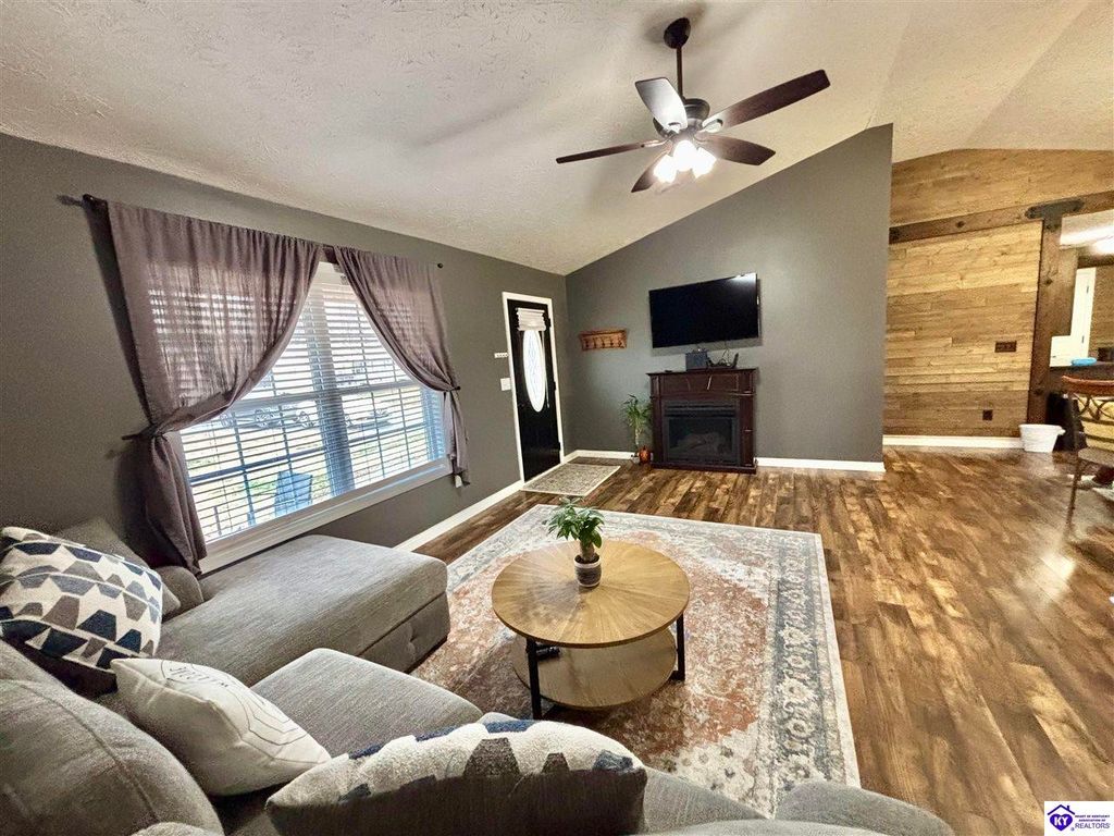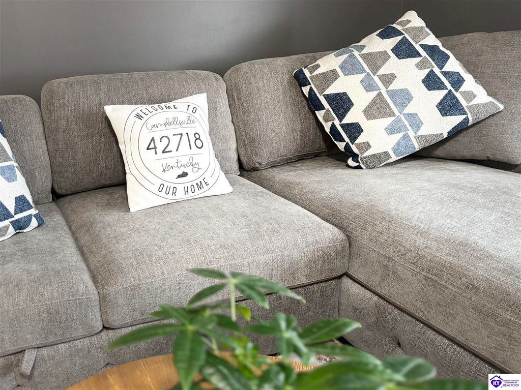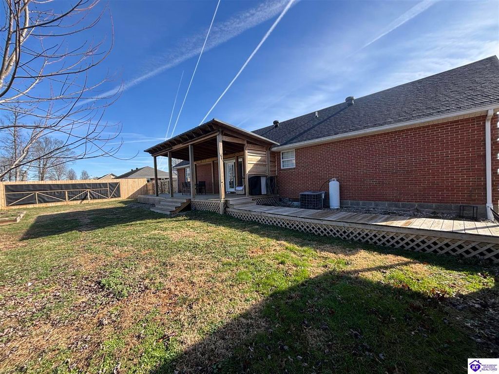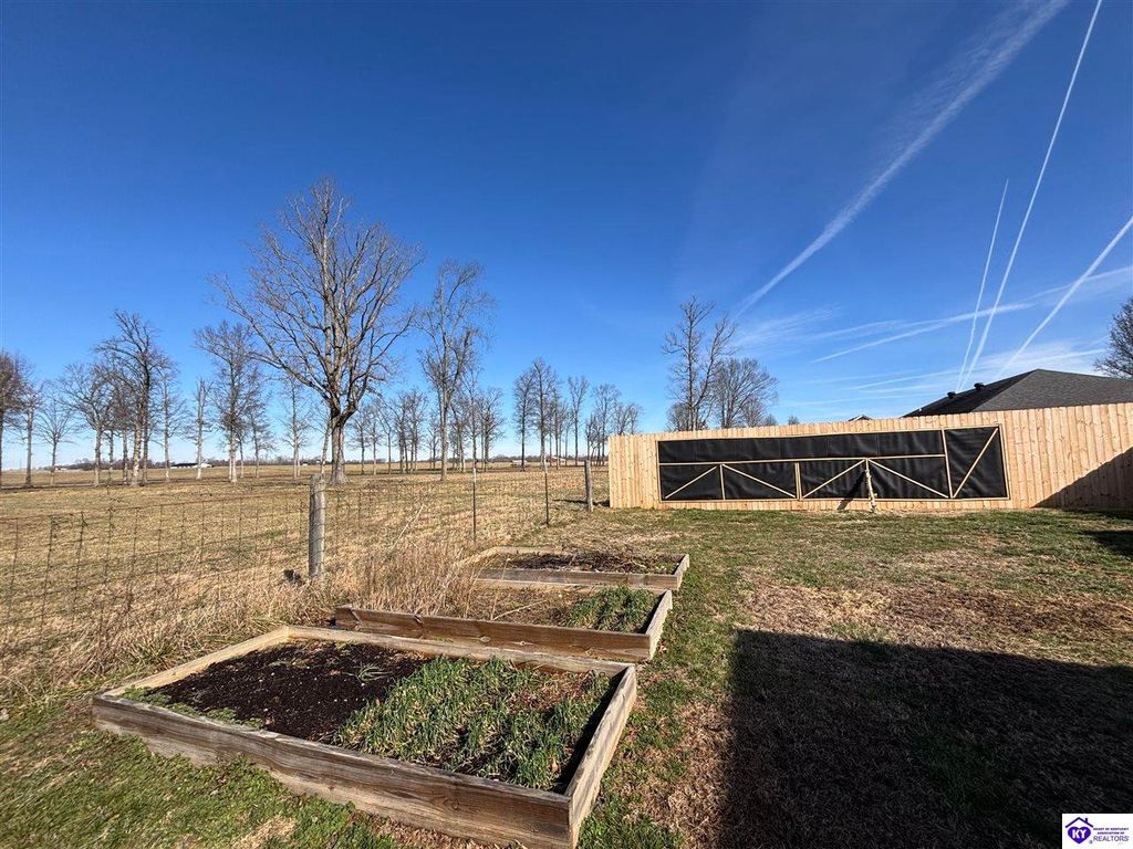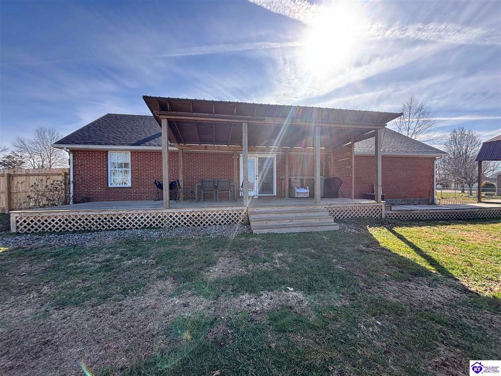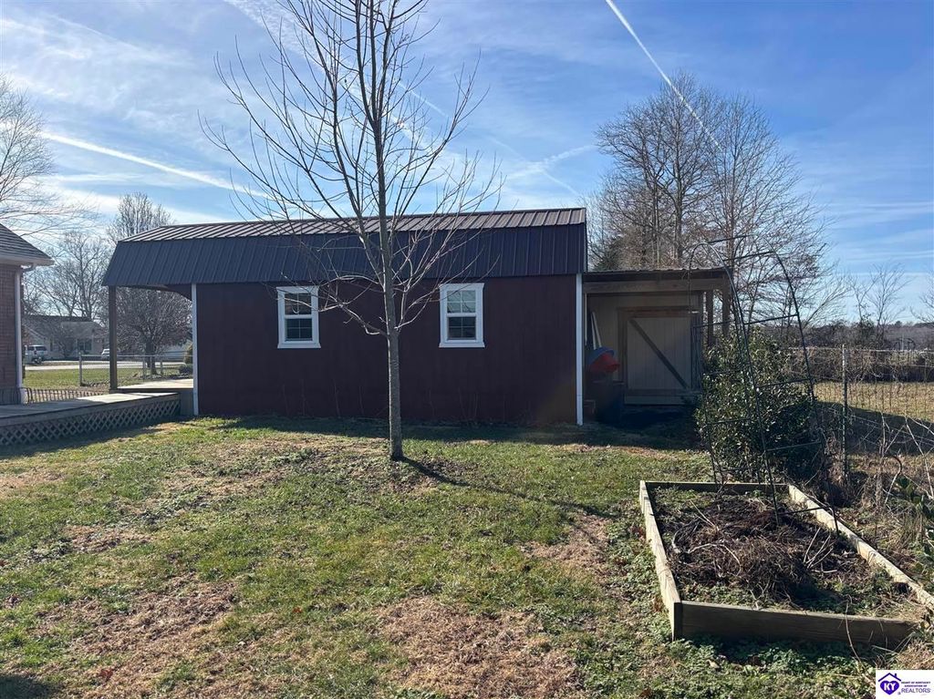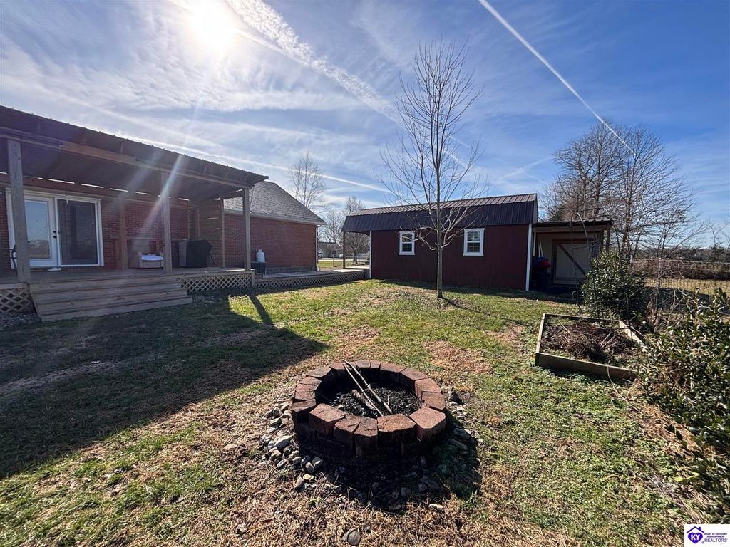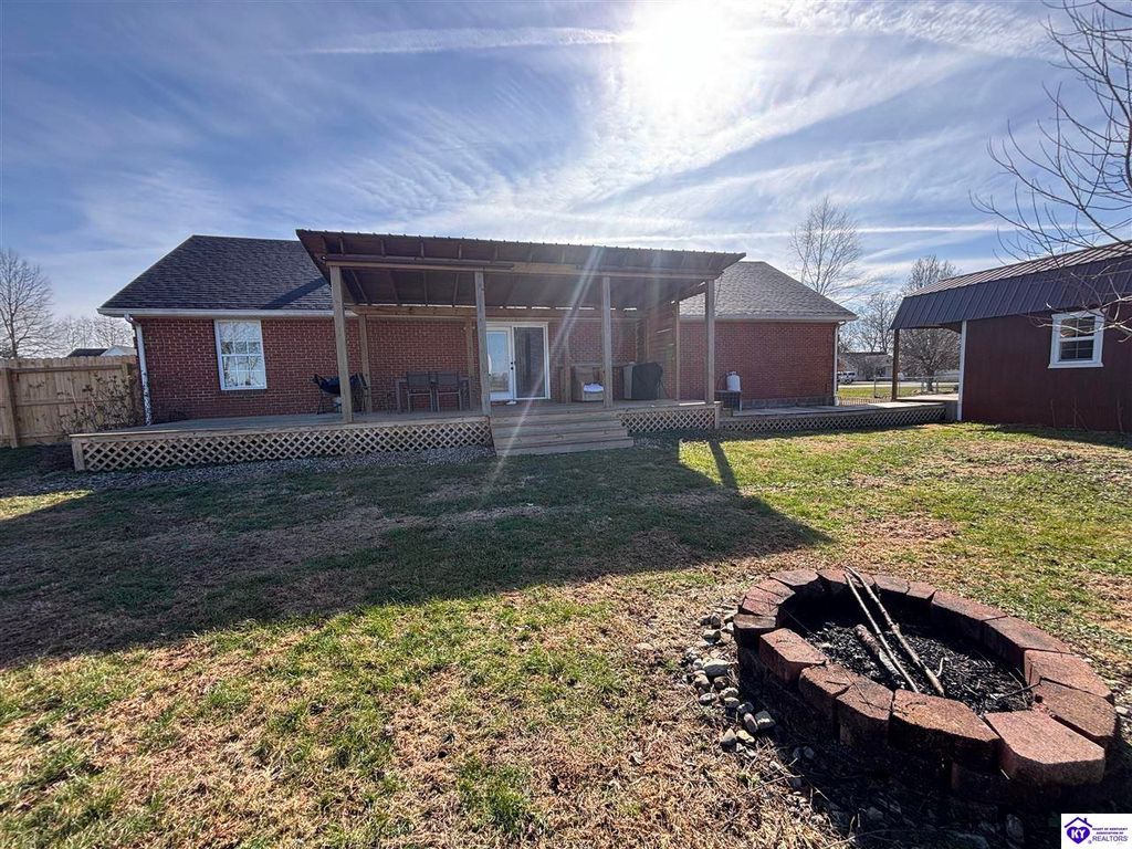 BACKYARD BLISS! This residence presents an abundance of charm, offering a captivating exterior fa ade. Upon entering, the attractive front covered porch immediately captures attention, showcasing elegant vaulted ceilings within an open-concept layout that seamlessly integrates the dining and kitchen areas, flooded with natural light. The split floor plan configuration is particularly desirable. The primary suite boasts distinctive tree ceilings, lending character, and features an en-suite bathroomt. The additional bedrooms are generously proportioned, each with sizable closets. A recently renovated second bathroom now offers an open layout, conveniently combined with laundry facilities and bespoke cabinetry. The kitchen, dining, and eating area is distinguished by stylish woodwork, creating a beautiful space. A spacious single-car garage, expansive deck with fire pit, and covered area provide ample opportunities for relaxation and taking in the views, complemented by garden boxes and a newly installed privacy fence. The storage capacity of the property is noteworthy, with an outbuilding featuring electrical connections, a loft, and additional storage under a lean-to structure, presenting numerous possibilities. SO MUCH TO LOVE! Located in the Heart of Kentucky, this residence is mere miles from Green River Lake and offers convenient access to shopping, restaurants, boutiques, a hospital, and the Campbellsville Country Club. Data believed to be correct but not guaranteed. Buyer to verify data prior to offer.
