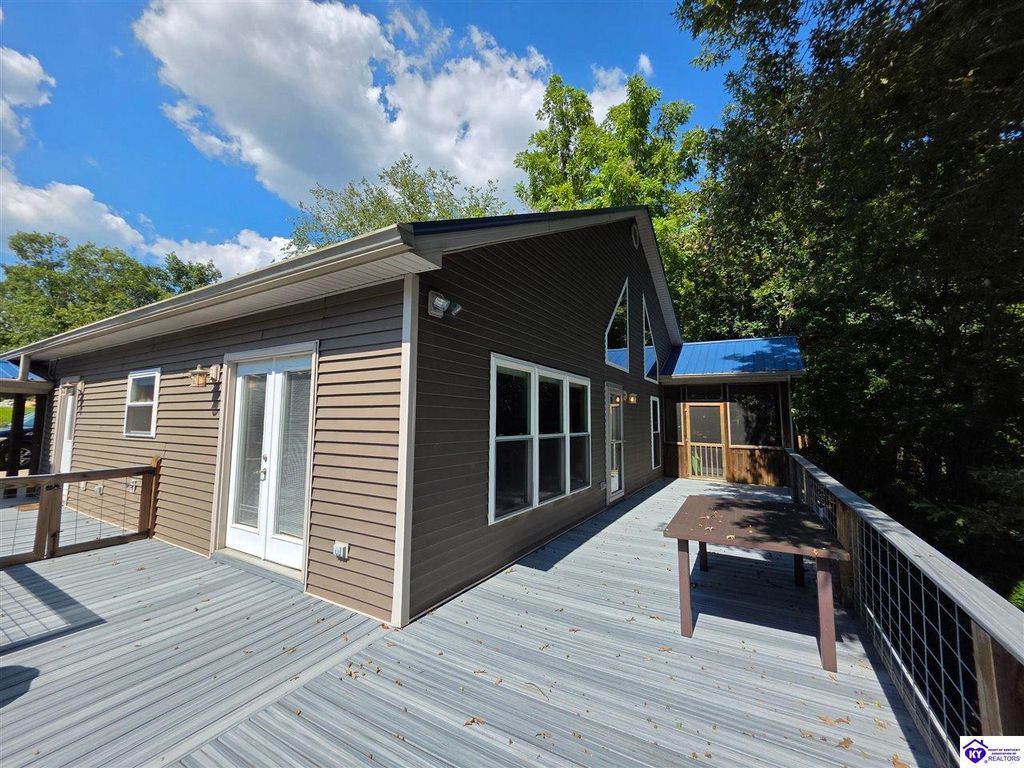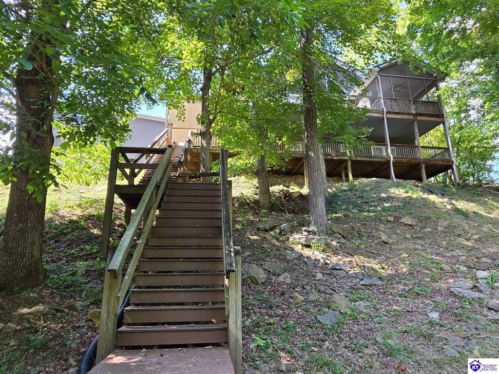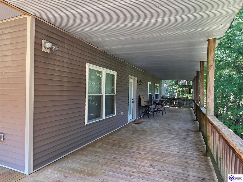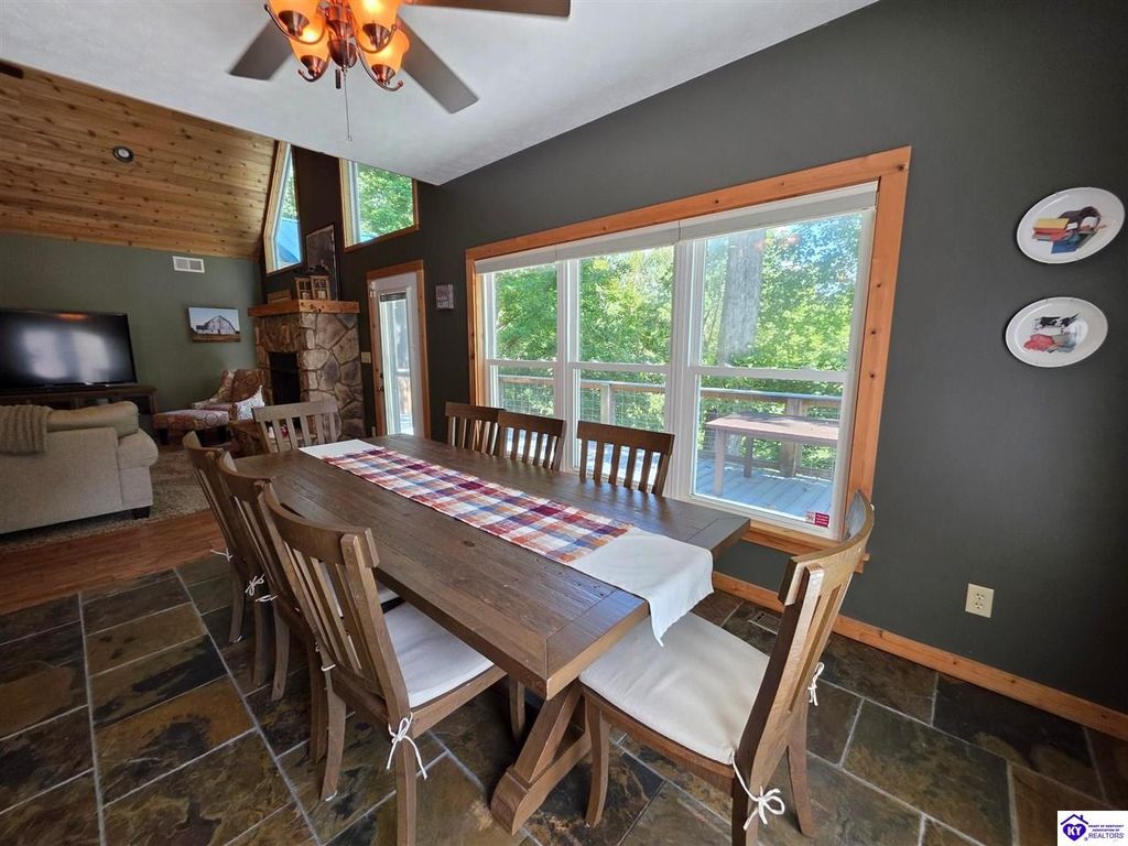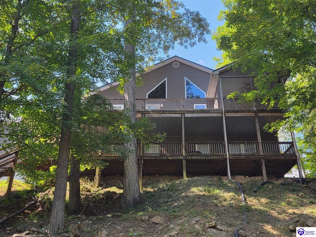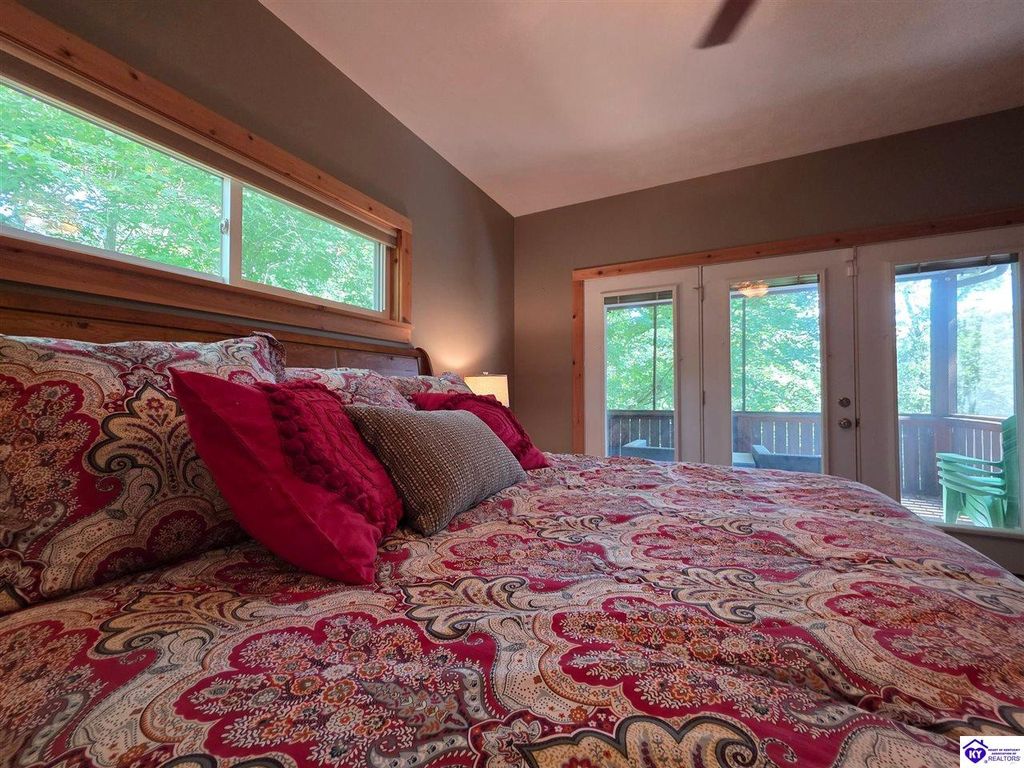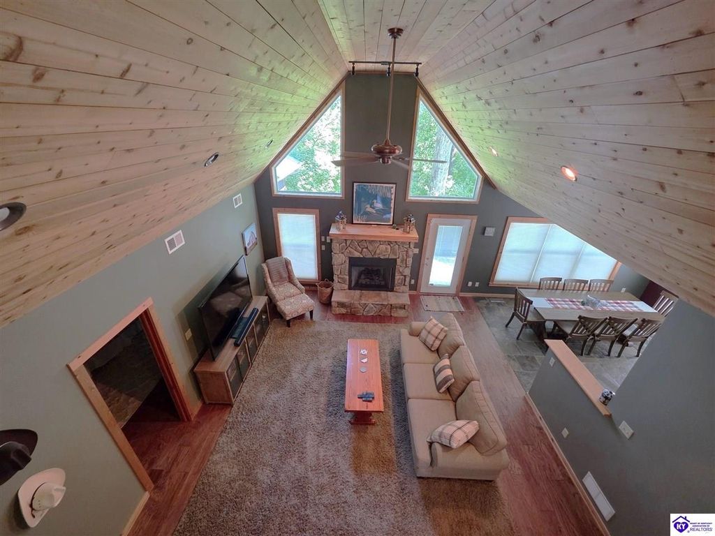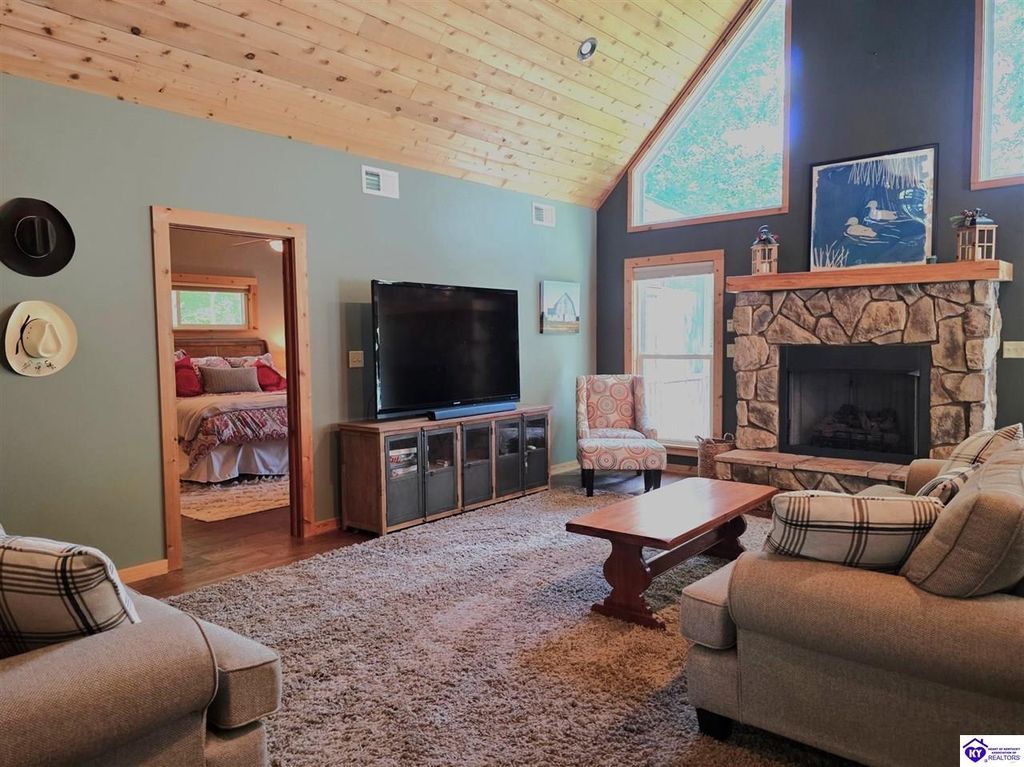 AVAILALBE FOR A LIMITED TIME THIS SEASON! Discover the charm of this stunning waterfront home, perfectly situated on two lots with two docks at the bottom of the property. This residence offers a blend of modern amenities and cozy living spaces, making it an ideal retreat for families and friends. 4 bedrooms and a 5th sleeping area or multi-purpose room - and TONS of parking, you can bring your family and friends and still have some privacy! Multiple decks let you spread out there too! TWO waterfront lots, TWO docks (one with 2 jet ski ports that stay!) Furniture is available too! Located in a beautiful neighborhood near two ramps, this home is in the middle of everything by land and by water. The super chill location on a cove off Long Lick Creek is perfect for kayaking, floating, or sunbathing on the docks. Step inside and be instantly greeted by cozy, warm colors that blend perfectly with the natural setting of this lake home. Just off the large foyer is a guest bedroom, full bath, stairs to the loft sleeping area AND catch your first glimpse of that beautiful great room! This open-concept living area is where you'll find that BIG, stone fireplace as the centerpiece of the lake-side wall. Beautiful stone floors help to set the mood for living at the lake! The great room opens up to the main living areas, providing a spacious and inviting atmosphere. With lots of sleeping areas and tons of parking options, there's plenty of room for everyone! There's even room for a large camper or RV in the detached, multipurpose shed! Adjacent to the fireplace is a crowd-sized dining area with a window wall and adjoining kitchen. The custom kitchen comes with tons of cabinets and upgrades, making it a chef's dream! The main level laundry is conveniently located near the outdoors, adding to the home's practicality. The primary bedroom suite on the main level includes a bath with heated floors, a tile shower, and a vintage-style tub. There's also a screen porch off the primary bedroom for morning coffee or afternoon naps. The lower level features a family area with an electric fireplace that changes colors, a dining or card table, and another lounging area to relax. The bunk room on this level comfortably sleeps eight, and there's another sleeping area or multi-purpose room that's plumbed for a future bar. Storage is abundant both inside and outside the home, including a huge RV-sized shed with tall overhead doors that let you drive THROUGH the building!