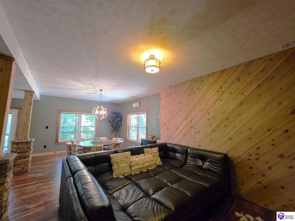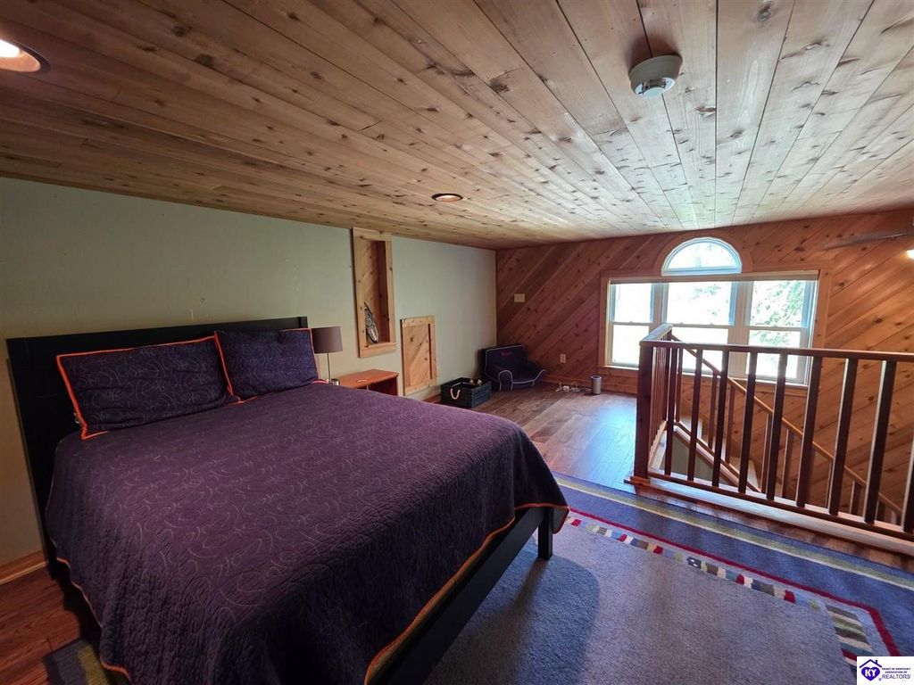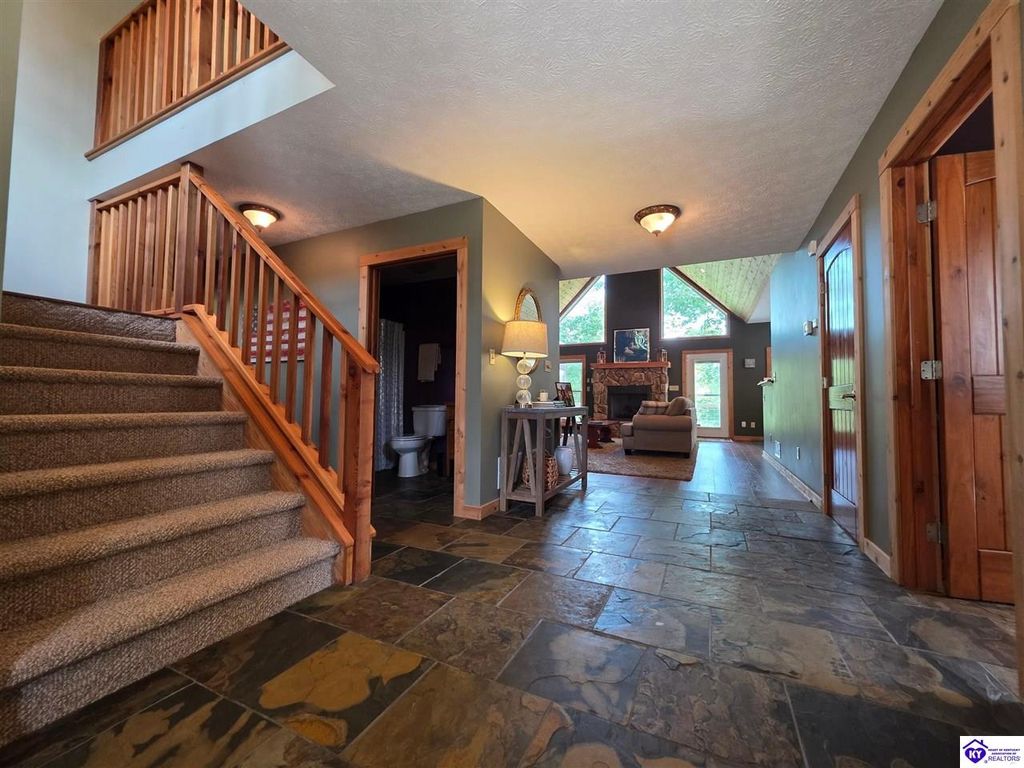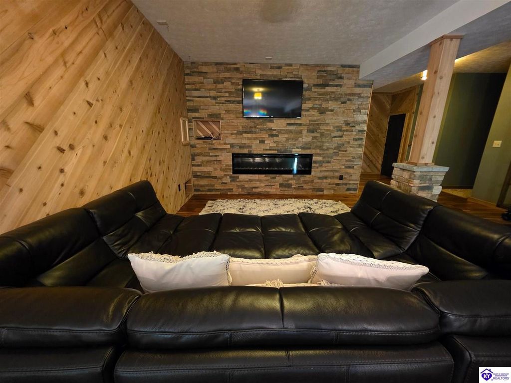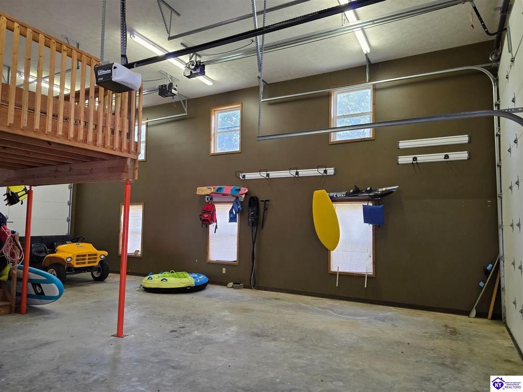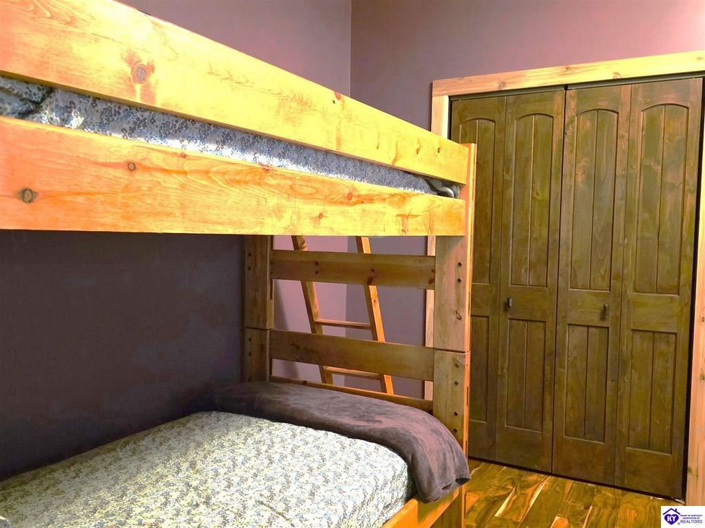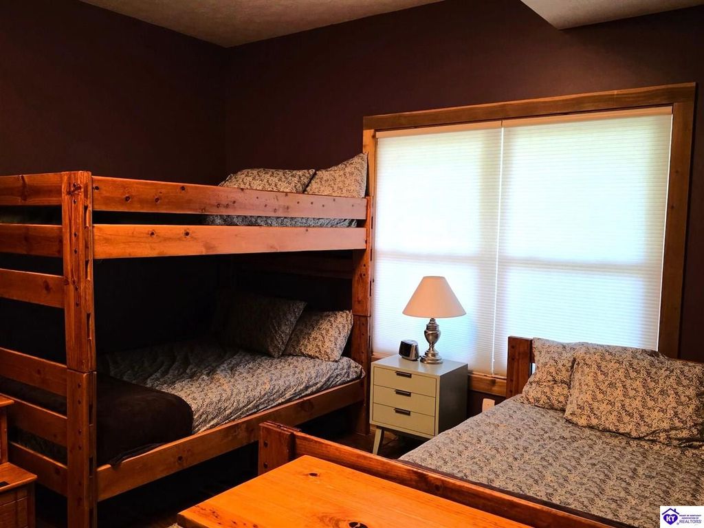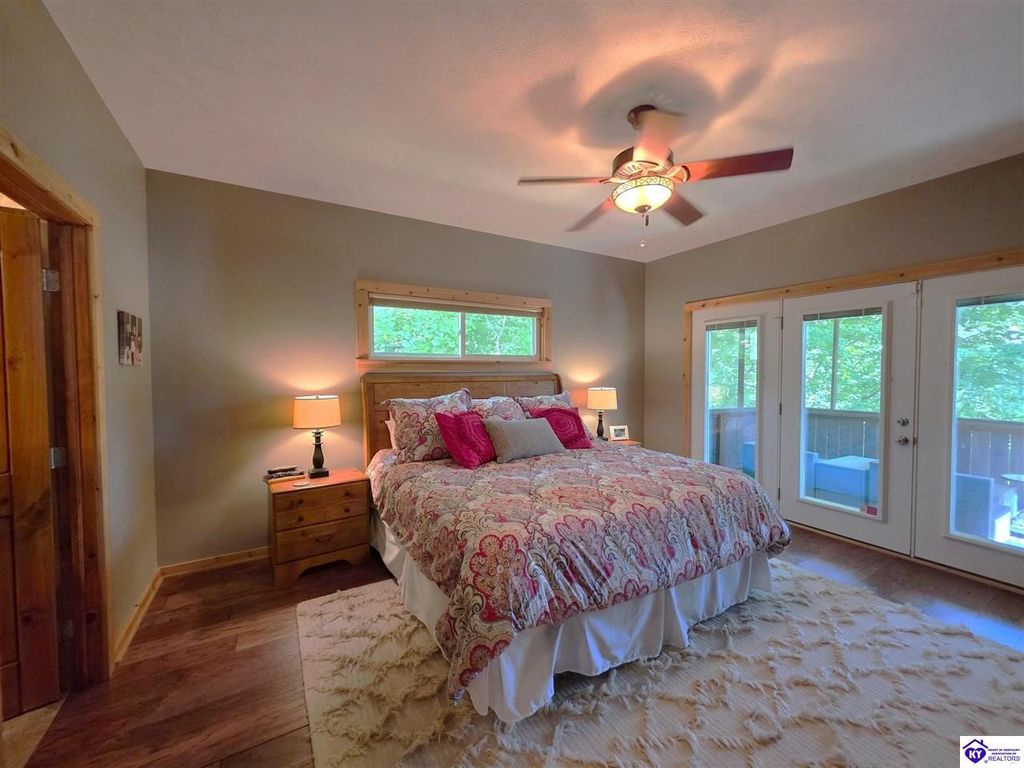 AVAILALBE FOR A LIMITED TIME THIS SEASON! Discover the charm of this stunning waterfront home, perfectly situated on two lots with two docks at the bottom of the property. This residence offers a blend of modern amenities and cozy living spaces, making it an ideal retreat for families and friends. 4 bedrooms and a 5th sleeping area or multi-purpose room - and TONS of parking, you can bring your family and friends and still have some privacy! Multiple decks let you spread out there too! TWO waterfront lots, TWO docks (one with 2 jet ski ports that stay!) Furniture is available too! Located in a beautiful neighborhood near two ramps, this home is in the middle of everything by land and by water. The super chill location on a cove off Long Lick Creek is perfect for kayaking, floating, or sunbathing on the docks. Step inside and be instantly greeted by cozy, warm colors that blend perfectly with the natural setting of this lake home. Just off the large foyer is a guest bedroom, full bath, stairs to the loft sleeping area AND catch your first glimpse of that beautiful great room! This open-concept living area is where you'll find that BIG, stone fireplace as the centerpiece of the lake-side wall. Beautiful stone floors help to set the mood for living at the lake! The great room opens up to the main living areas, providing a spacious and inviting atmosphere. With lots of sleeping areas and tons of parking options, there's plenty of room for everyone! There's even room for a large camper or RV in the detached, multipurpose shed! Adjacent to the fireplace is a crowd-sized dining area with a window wall and adjoining kitchen. The custom kitchen comes with tons of cabinets and upgrades, making it a chef's dream! The main level laundry is conveniently located near the outdoors, adding to the home's practicality. The primary bedroom suite on the main level includes a bath with heated floors, a tile shower, and a vintage-style tub. There's also a screen porch off the primary bedroom for morning coffee or afternoon naps. The lower level features a family area with an electric fireplace that changes colors, a dining or card table, and another lounging area to relax. The bunk room on this level comfortably sleeps eight, and there's another sleeping area or multi-purpose room that's plumbed for a future bar. Storage is abundant both inside and outside the home, including a huge RV-sized shed with tall overhead doors that let you drive THROUGH the building!