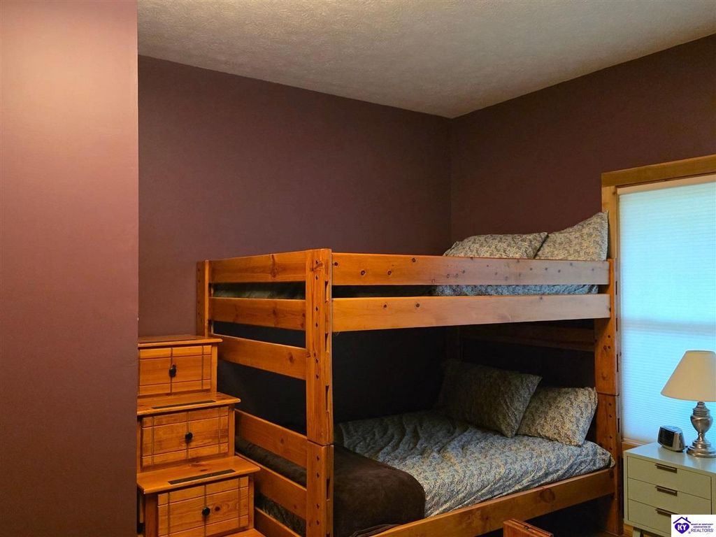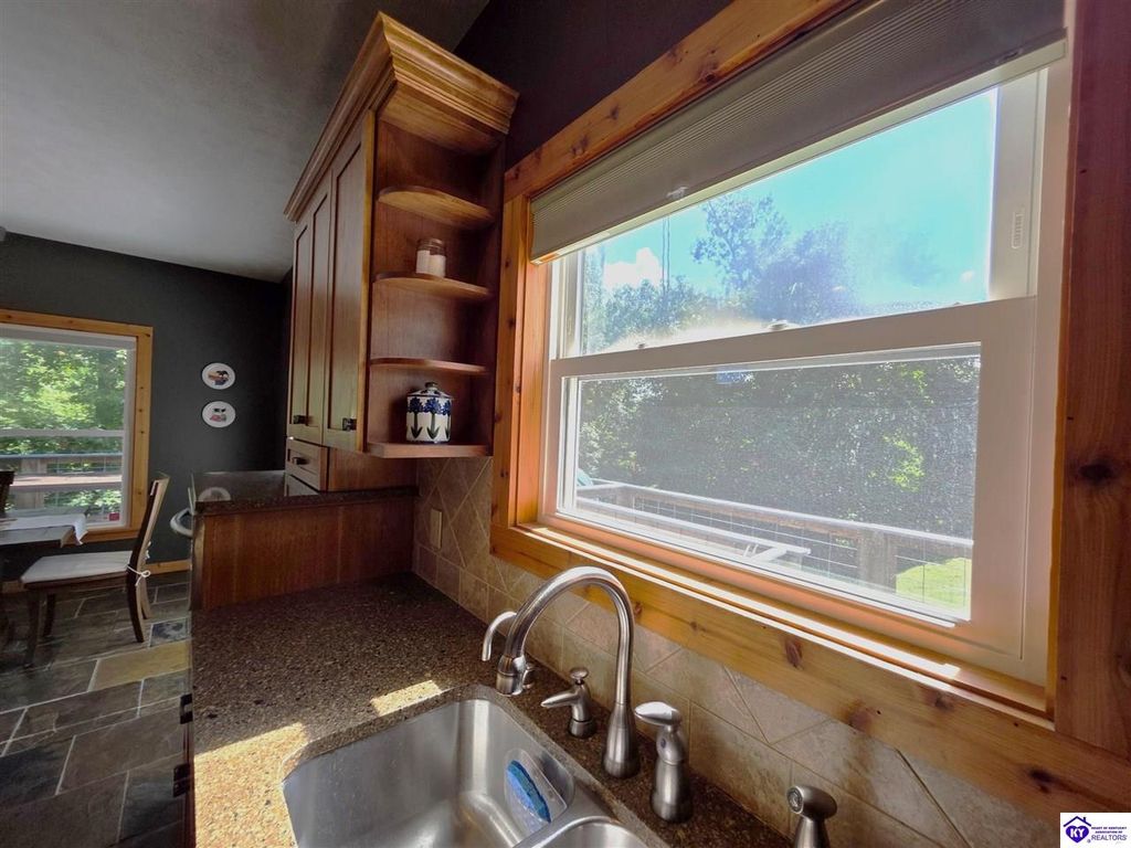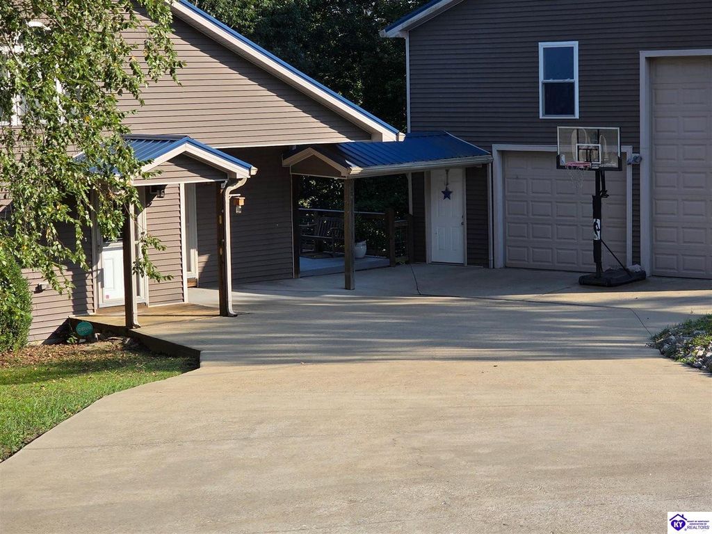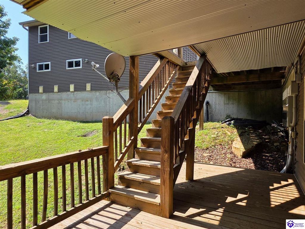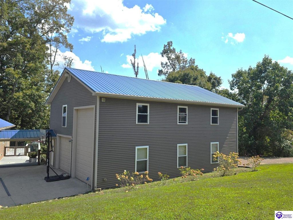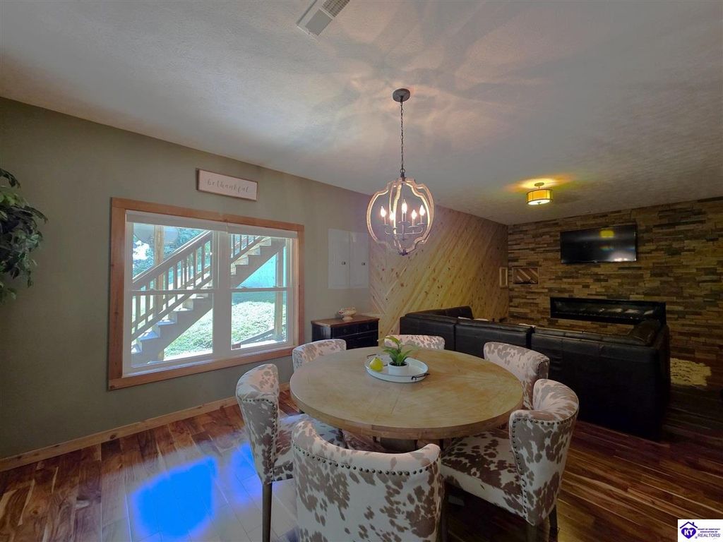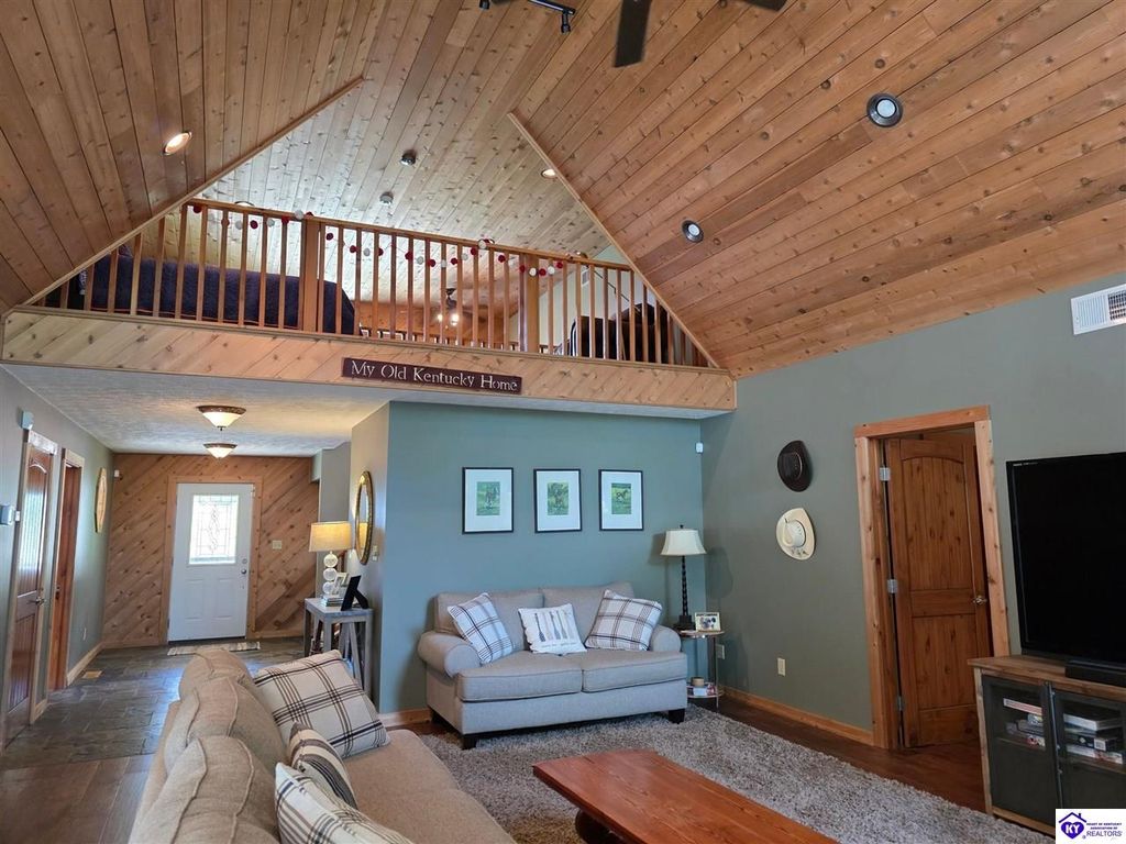 AVAILALBE FOR A LIMITED TIME THIS SEASON! Discover the charm of this stunning waterfront home, perfectly situated on two lots with two docks at the bottom of the property. This residence offers a blend of modern amenities and cozy living spaces, making it an ideal retreat for families and friends. 4 bedrooms and a 5th sleeping area or multi-purpose room - and TONS of parking, you can bring your family and friends and still have some privacy! Multiple decks let you spread out there too! TWO waterfront lots, TWO docks (one with 2 jet ski ports that stay!) Furniture is available too! Located in a beautiful neighborhood near two ramps, this home is in the middle of everything by land and by water. The super chill location on a cove off Long Lick Creek is perfect for kayaking, floating, or sunbathing on the docks. Step inside and be instantly greeted by cozy, warm colors that blend perfectly with the natural setting of this lake home. Just off the large foyer is a guest bedroom, full bath, stairs to the loft sleeping area AND catch your first glimpse of that beautiful great room! This open-concept living area is where you'll find that BIG, stone fireplace as the centerpiece of the lake-side wall. Beautiful stone floors help to set the mood for living at the lake! The great room opens up to the main living areas, providing a spacious and inviting atmosphere. With lots of sleeping areas and tons of parking options, there's plenty of room for everyone! There's even room for a large camper or RV in the detached, multipurpose shed! Adjacent to the fireplace is a crowd-sized dining area with a window wall and adjoining kitchen. The custom kitchen comes with tons of cabinets and upgrades, making it a chef's dream! The main level laundry is conveniently located near the outdoors, adding to the home's practicality. The primary bedroom suite on the main level includes a bath with heated floors, a tile shower, and a vintage-style tub. There's also a screen porch off the primary bedroom for morning coffee or afternoon naps. The lower level features a family area with an electric fireplace that changes colors, a dining or card table, and another lounging area to relax. The bunk room on this level comfortably sleeps eight, and there's another sleeping area or multi-purpose room that's plumbed for a future bar. Storage is abundant both inside and outside the home, including a huge RV-sized shed with tall overhead doors that let you drive THROUGH the building!
