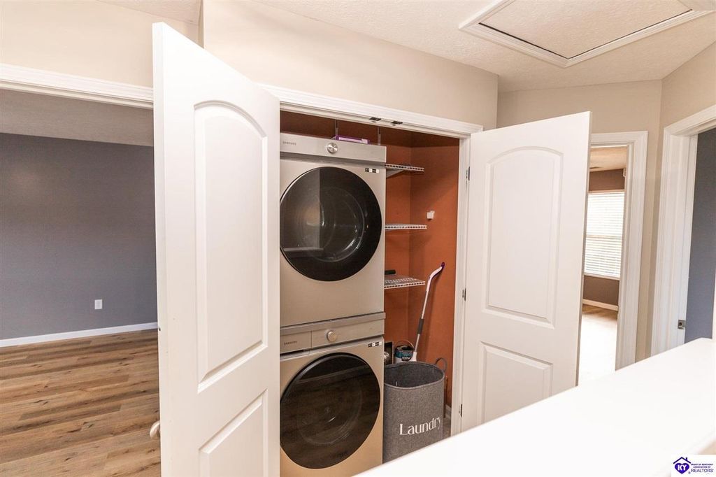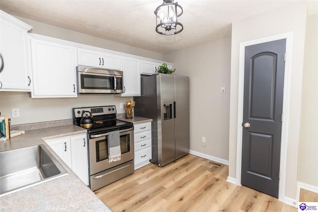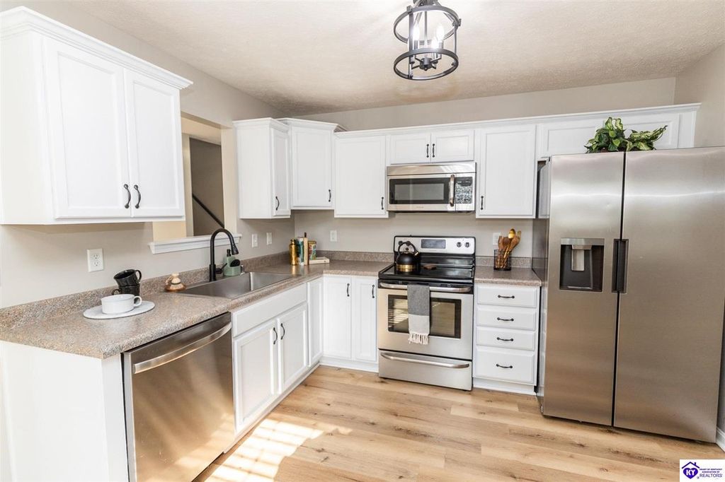 Come tour this lovely 3 bedroom, 2 and a half bath home in Elizabethtown. This home has been very well maintained with many stylish updates. Entering from the front door, you have several places to hang your coat, purse, or backpack. Once in the home, the main living area has beautiful vinyl plank flooring and is just open enough for entertaining, but the kitchen and living areas are enough off to the side to have a private conversation. The kitchen features stainless steel appliances, plenty of counter space, loads of cabinets, and a pantry. The dining area sits just off the kitchen and looks over the back yard. The living room is large and is laid out in a very open and inviting way. For additional guest comfort, the main floor also has a half bathroom. All the bedrooms are upstairs with the primary suite being quite large. It has a nice walk-in closet and a private full bathroom. The two guest bedrooms are nicely sized, and both have ceiling fans and vinyl plank flooring. Also upstairs is the laundry closet with a front loading washer and dryer set that stays with the home. The walk-out basement is a wonderful place for anything from gathering and games, or snuggling in solitude with a good book from your personal library stored in wall to wall built in bookcases. You can take a break and step out of the basement on to the large patio space, built perfectly for relaxing. The back yard is fenced and has a nice view of woods behind the home. Don't miss your opportunity to own a great home just minutes from all the amenities of town and a short drive to Fort Knox or the Blue Oval Factory. Schedule your private showing today!