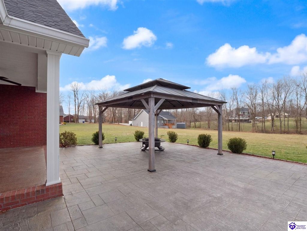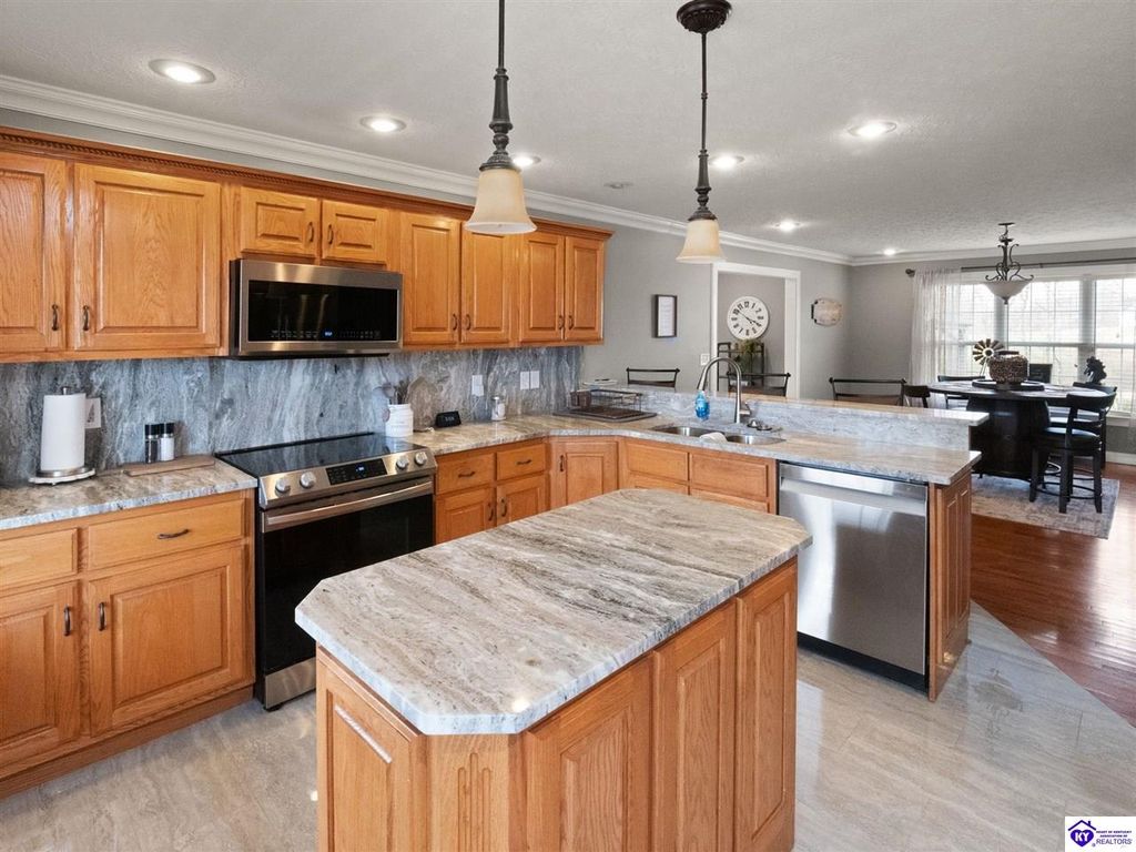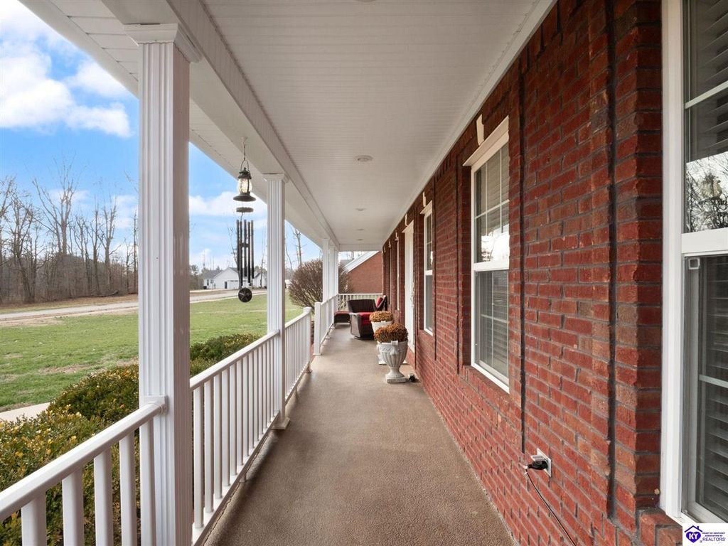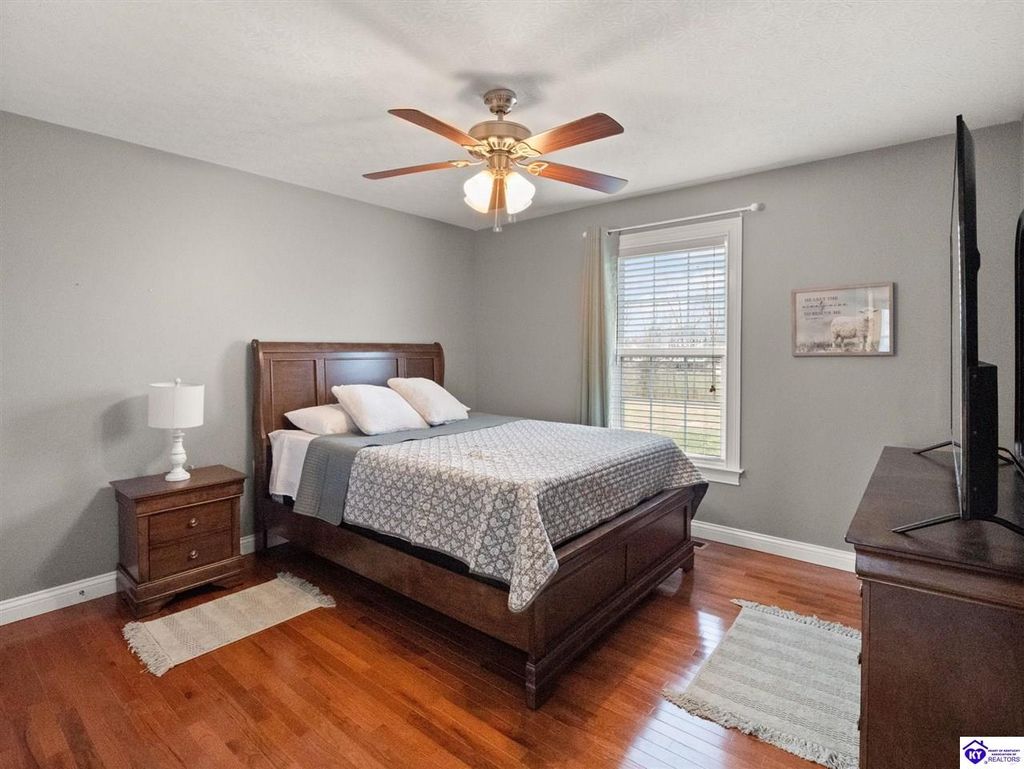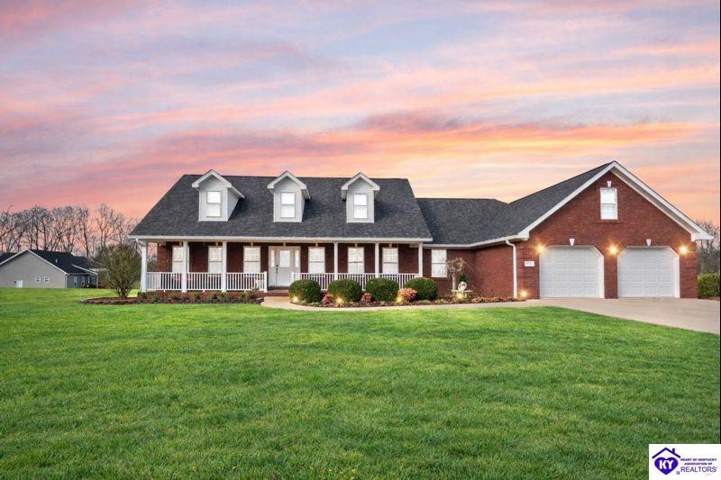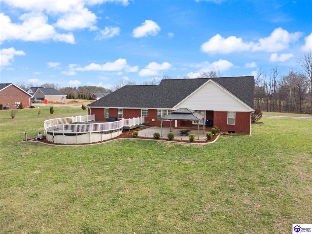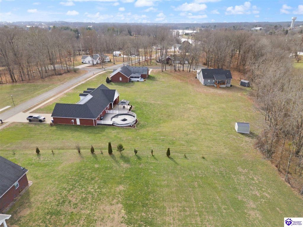Beautiful all Brick 1.5-story residence located in Bluegrass Estates, offering 5 bedrooms and 3 full bathrooms with generous living space ideal for refined family living. From the moment you enter, a welcoming living room sets the tone for the quality and craftsmanship found throughout the home. The open concept kitchen is beautifully appointed with all new, top of the line Samsung appliances, including an oven with a built-in air fryer, custom cabinetry, a large island with breakfast bar seating, and a spacious pantry. A dedicated laundry room and utility closet provide added convenience. Luxury finishes include hardwood flooring throughout, marble flooring in all bathrooms and the utility room, and elegant crown molding throughout the home. The main level features three bedrooms, including a grand primary suite with a stunning tray ceiling, double vanity, scenic views, and a spa-inspired bathroom complete with a beautiful soaking tub, and a walk-in shower. The upper level offers two additional bedrooms with hardwood flooring, a large, spacious bathroom, and a walk-in storage room over the garage, providing the flexibility to create an additional bedroom, private office, or bonus space. Designed with comfort and efficiency in mind, the home is heated and cooled by a geothermal HVAC system, delivering exceptional energy efficiency and lower utility costs. The outdoor living space is equally impressive on a 1.08 acre lot, featuring a spacious backyard ideal for large gatherings or letting pets roam freely. Enjoy a gazebo covered back porch, stamped concrete patio, and a composite deck surrounding the pool, complete with a new pump and ready for immediate enjoyment. This property is impeccably maintained and conveniently located near restaurants, shopping, banks, the post office, schools, and the city lake. As you can see, this home offers luxury, space, and an unbeatable location. So much to love, this is a great opportunity in Bluegrass Estates.