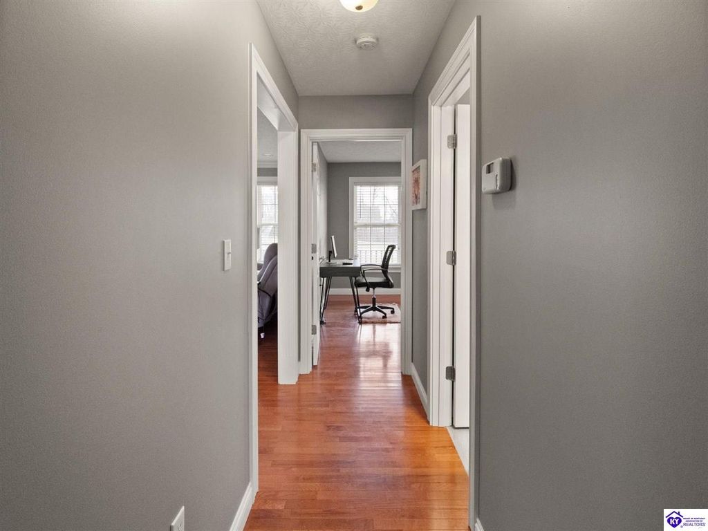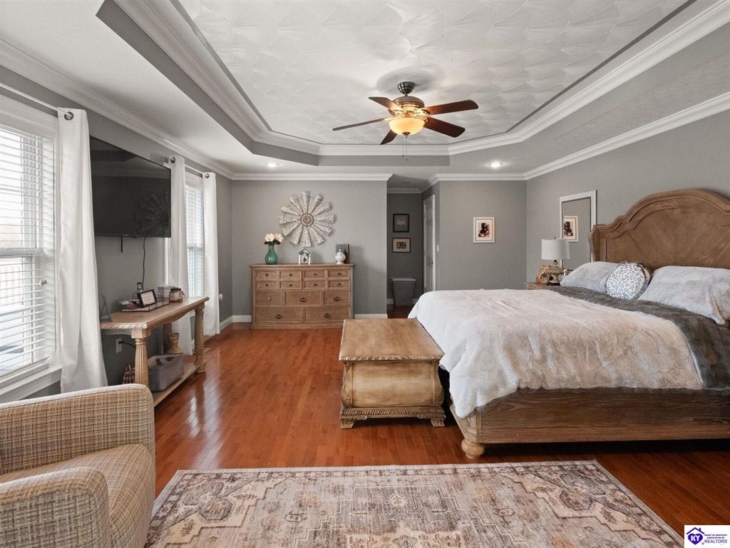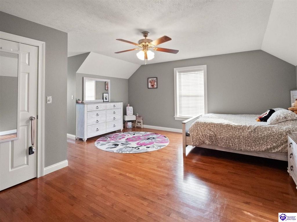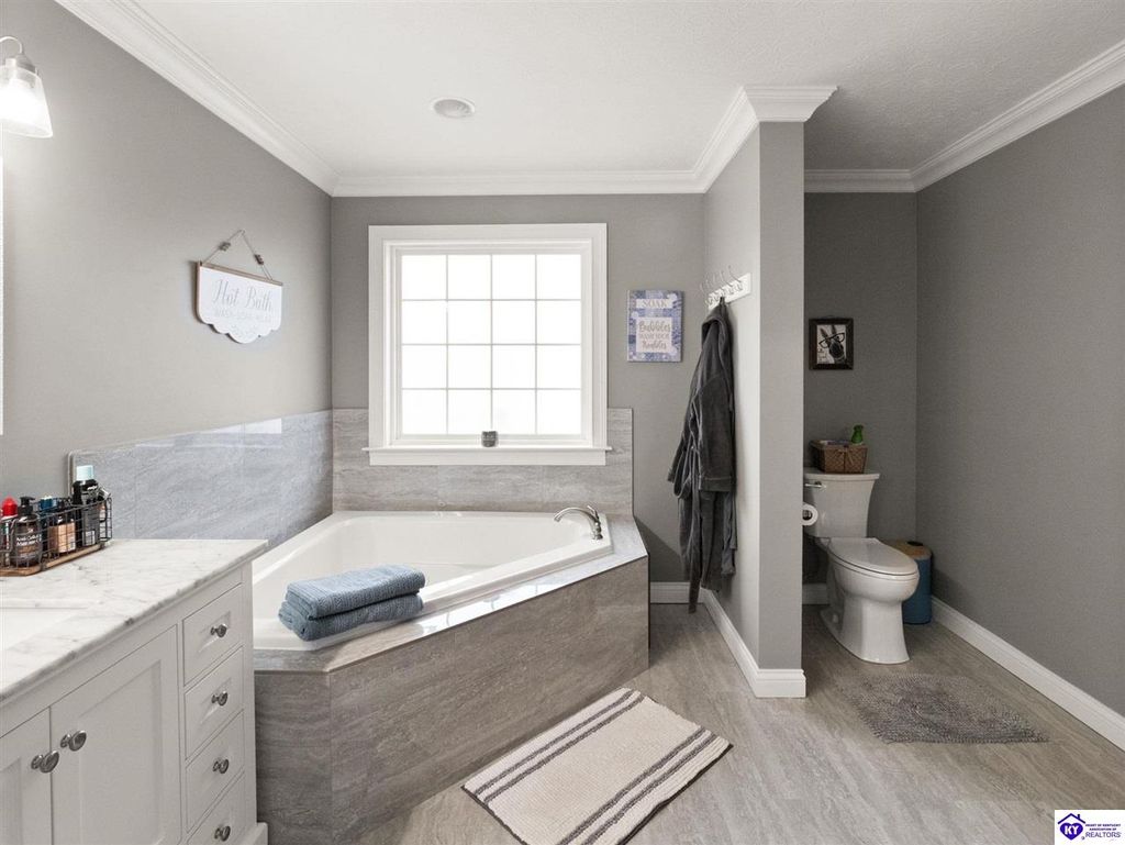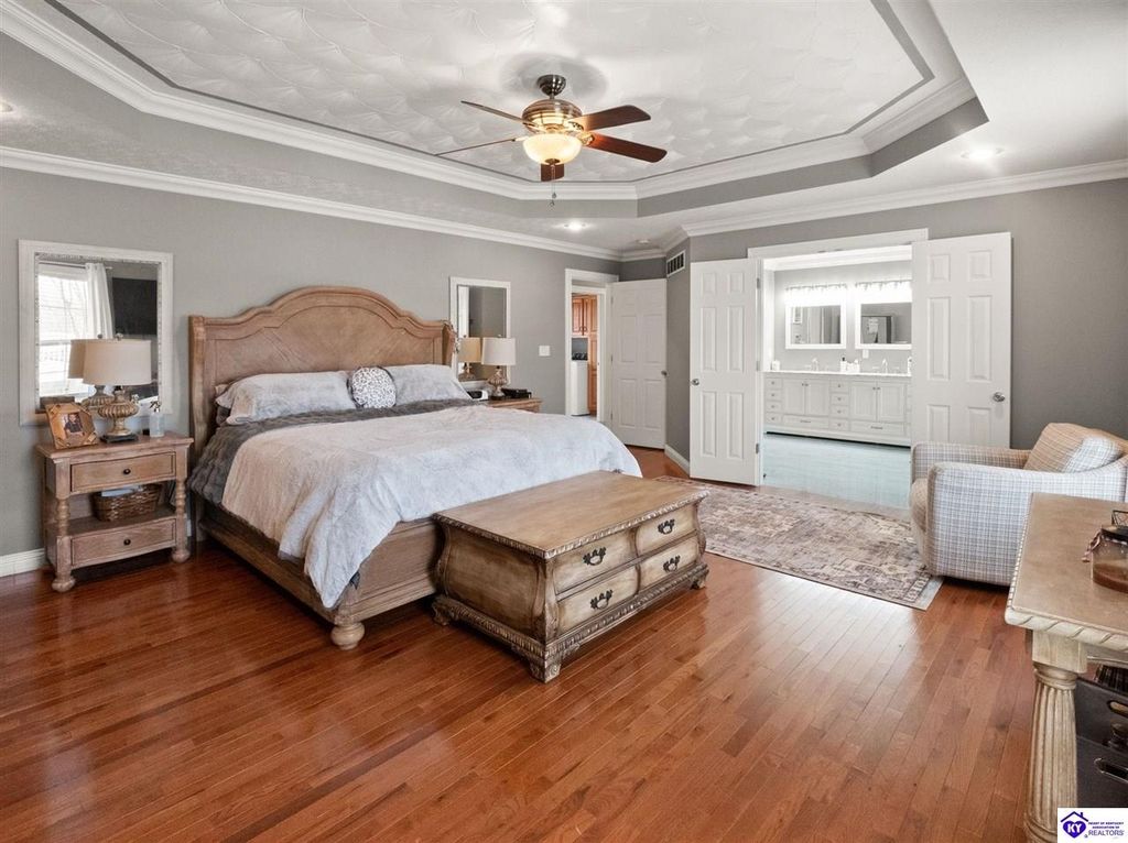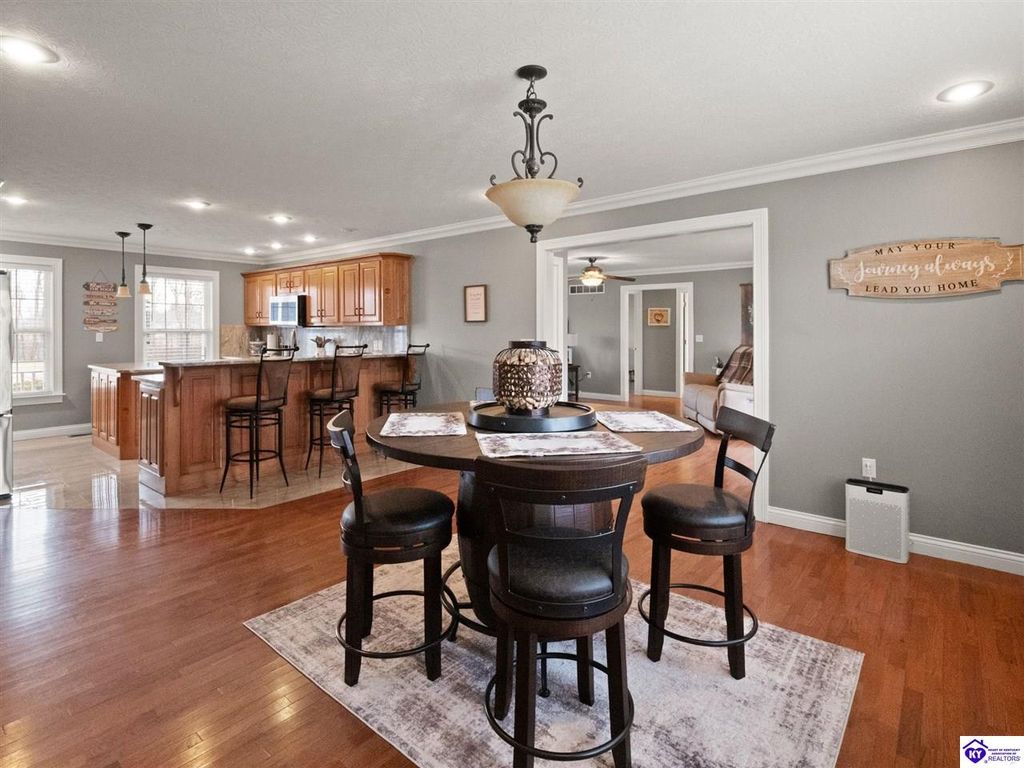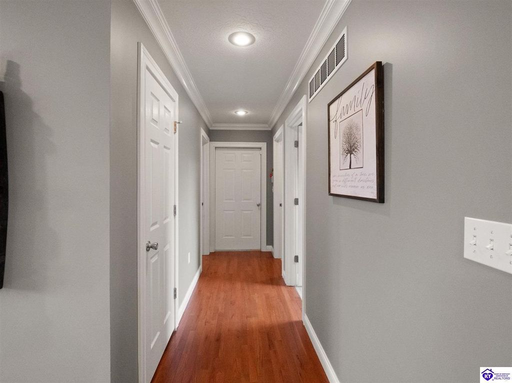 Beautiful all Brick 1.5-story residence located in Bluegrass Estates, offering 5 bedrooms and 3 full bathrooms with generous living space ideal for refined family living. From the moment you enter, a welcoming living room sets the tone for the quality and craftsmanship found throughout the home. The open concept kitchen is beautifully appointed with all new, top of the line Samsung appliances, including an oven with a built-in air fryer, custom cabinetry, a large island with breakfast bar seating, and a spacious pantry. A dedicated laundry room and utility closet provide added convenience. Luxury finishes include hardwood flooring throughout, marble flooring in all bathrooms and the utility room, and elegant crown molding throughout the home. The main level features three bedrooms, including a grand primary suite with a stunning tray ceiling, double vanity, scenic views, and a spa-inspired bathroom complete with a beautiful soaking tub, and a walk-in shower. The upper level offers two additional bedrooms with hardwood flooring, a large, spacious bathroom, and a walk-in storage room over the garage, providing the flexibility to create an additional bedroom, private office, or bonus space. Designed with comfort and efficiency in mind, the home is heated and cooled by a geothermal HVAC system, delivering exceptional energy efficiency and lower utility costs. The outdoor living space is equally impressive on a 1.08 acre lot, featuring a spacious backyard ideal for large gatherings or letting pets roam freely. Enjoy a gazebo covered back porch, stamped concrete patio, and a composite deck surrounding the pool, complete with a new pump and ready for immediate enjoyment. This property is impeccably maintained and conveniently located near restaurants, shopping, banks, the post office, schools, and the city lake. As you can see, this home offers luxury, space, and an unbeatable location. So much to love, this is a great opportunity in Bluegrass Estates.
