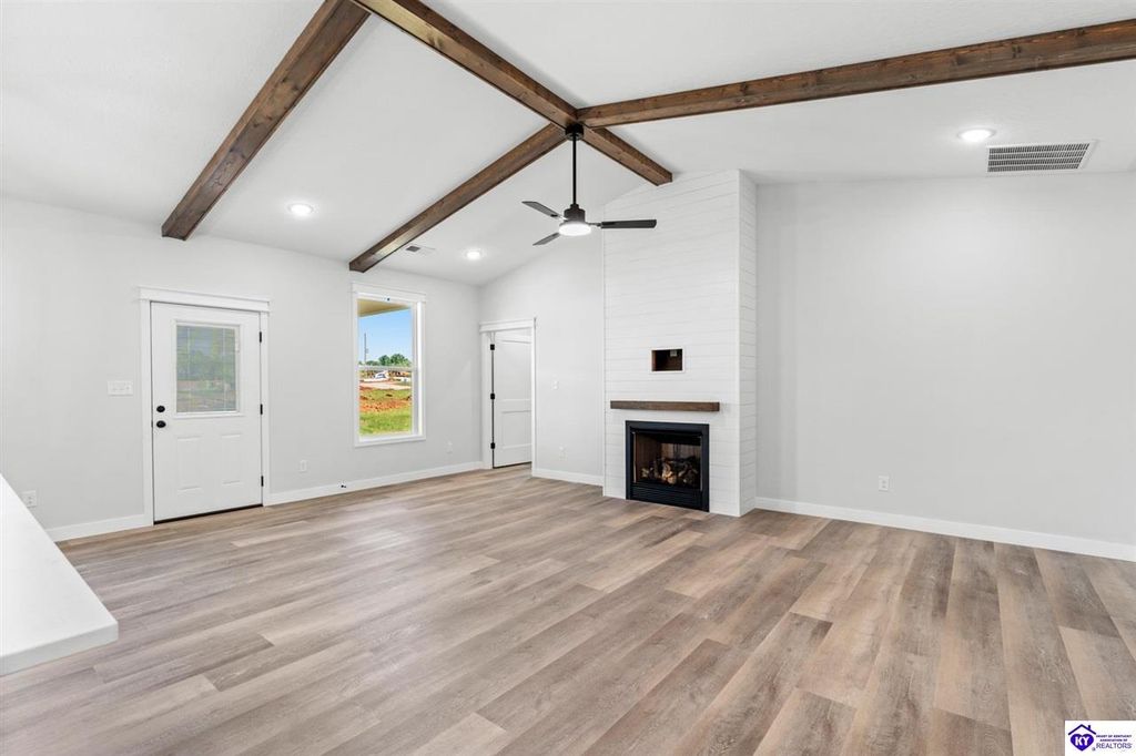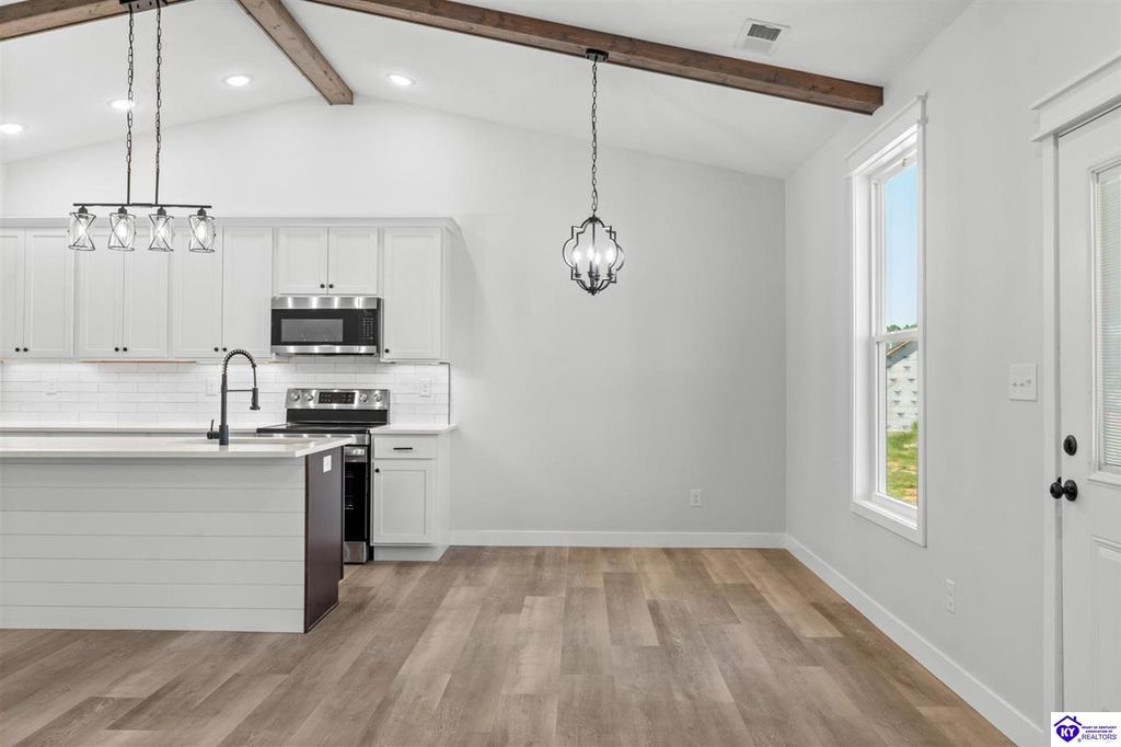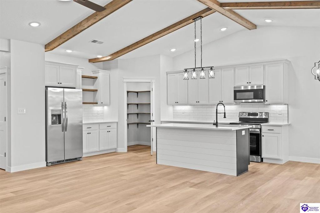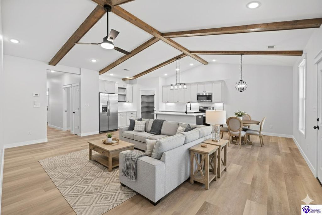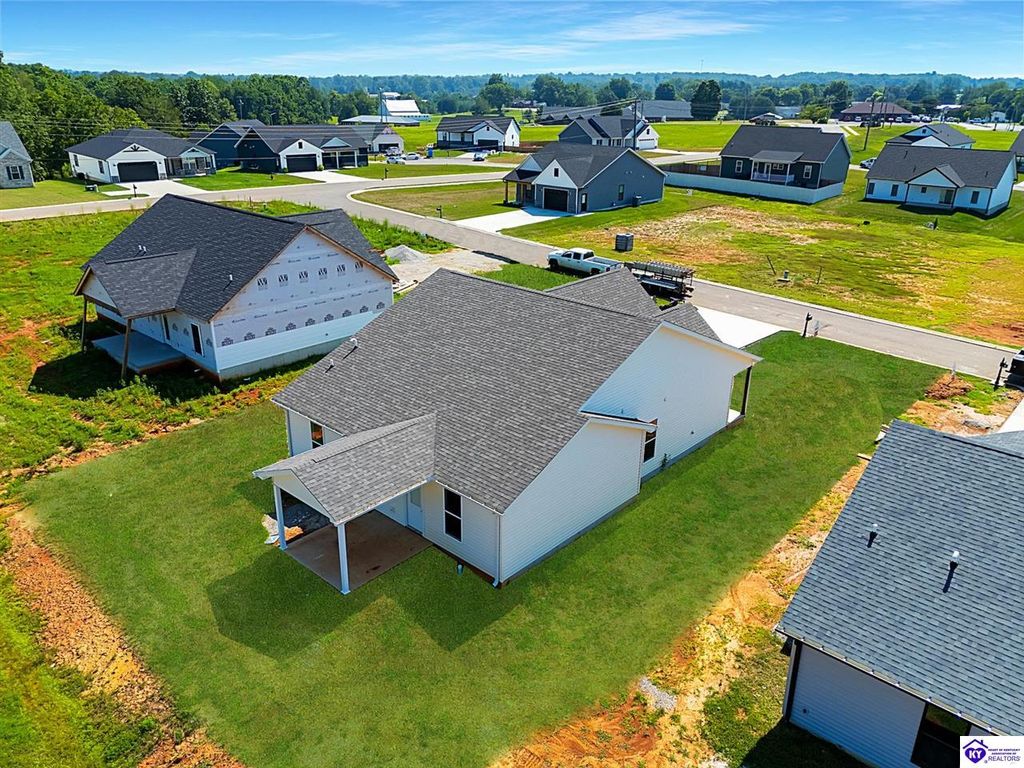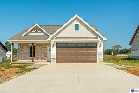 Welcome to 36 Robert Allen Lane, where luxury design meets modern efficiency in the sought-after Miller Woods subdivision of Brandenburg. Crafted with care and attention to detail, this 2025 new-construction ranch offers 1,749 square feet of single-level living in an elegant, energy-smart layout. Step inside to find an open floor plan accentuated by vaulted ceilings, rich vinyl plank flooring, and a seamless flow between the living, dining, and kitchen areas. The living room centers around a gas log fireplace - perfect for both relaxing evenings and entertaining guests. The kitchen blends function and beauty with granite countertops, a smooth-top range, built-in microwave, and refrigerator, along with a spacious eat-in area and bar seating. The private primary suite offers a true retreat, featuring a walk-in closet and a spa-inspired bath with double vanities, granite counters, and both a separate shower and tub/shower combo. Three additional bedrooms provide space for guests, work, or hobbies, all finished in the same refined style. This home also includes a dedicated laundry room, tankless water heater, foam insulation for year-round comfort, and central electric HVAC with propane heat. Outdoor living shines with both a covered front porch and a covered rear deck overlooking your level 0.23-acre lot, all set on a quiet cul-de-sac within Miller Woods. The home's attention to quality finishes ensure durability and sophistication. Public water and sewer add convenience, while the active HOA maintains neighborhood integrity. With proximity to dining, parks, and Meade County schools, 36 Robert Allen Lane combines refined living, modern comfort, and an unbeatable location.