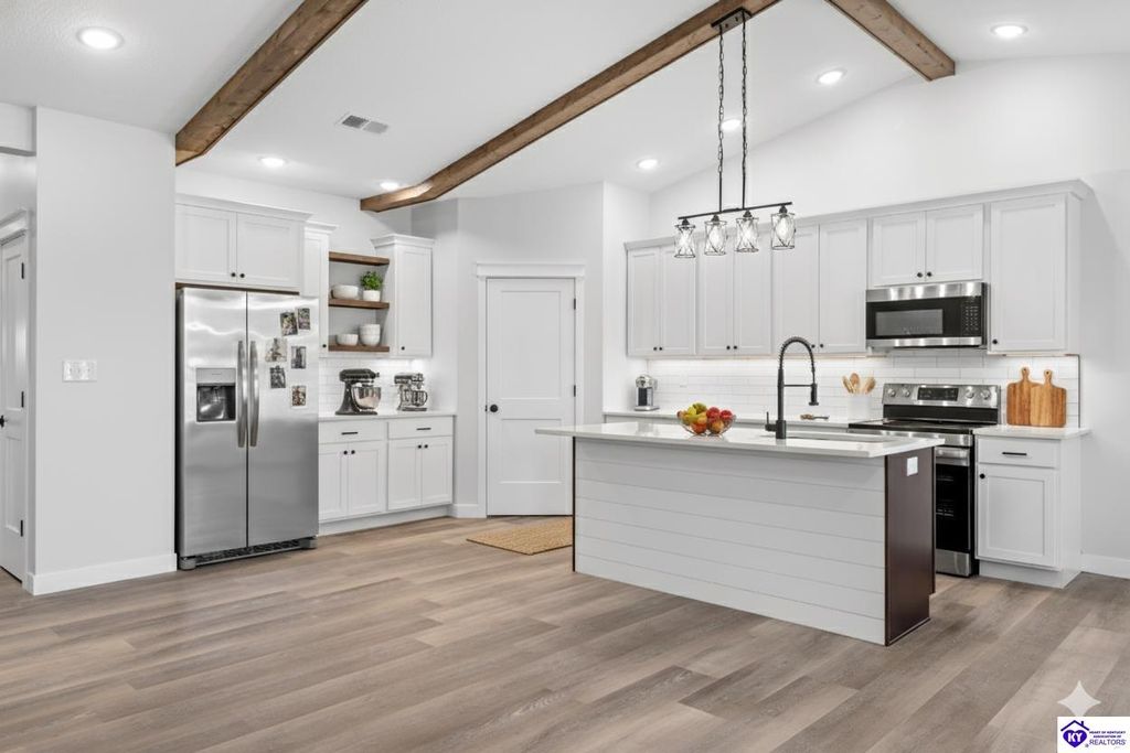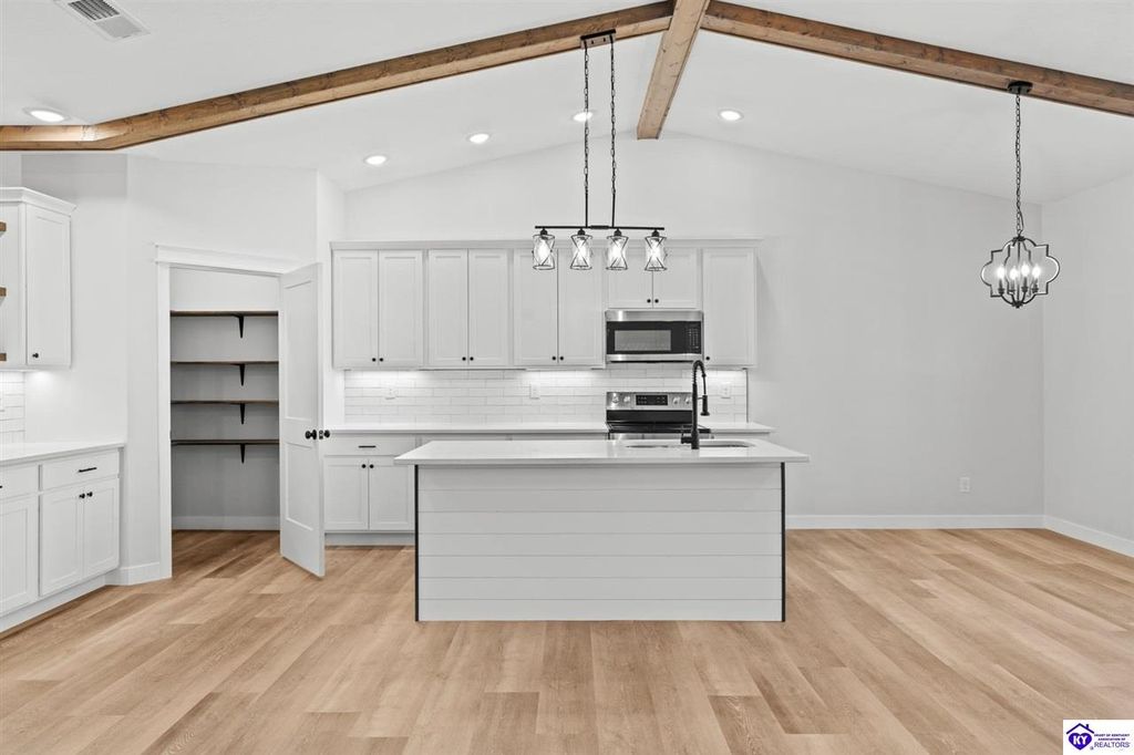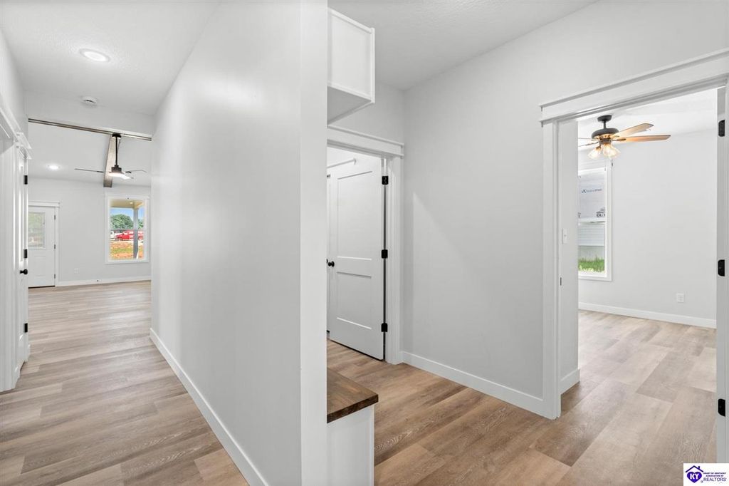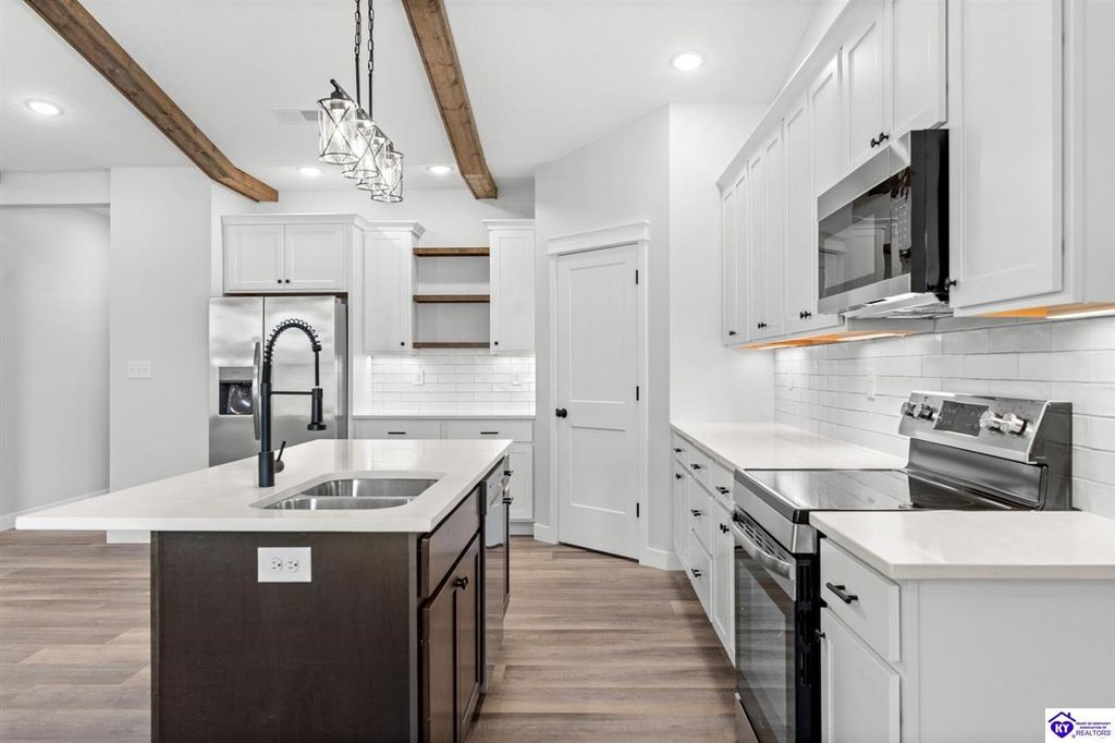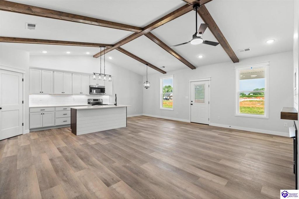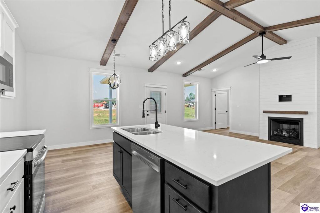 Welcome to 36 Robert Allen Lane, where luxury design meets modern efficiency in the sought-after Miller Woods subdivision of Brandenburg. Crafted with care and attention to detail, this 2025 new-construction ranch offers 1,749 square feet of single-level living in an elegant, energy-smart layout. Step inside to find an open floor plan accentuated by vaulted ceilings, rich vinyl plank flooring, and a seamless flow between the living, dining, and kitchen areas. The living room centers around a gas log fireplace - perfect for both relaxing evenings and entertaining guests. The kitchen blends function and beauty with granite countertops, a smooth-top range, built-in microwave, and refrigerator, along with a spacious eat-in area and bar seating. The private primary suite offers a true retreat, featuring a walk-in closet and a spa-inspired bath with double vanities, granite counters, and both a separate shower and tub/shower combo. Three additional bedrooms provide space for guests, work, or hobbies, all finished in the same refined style. This home also includes a dedicated laundry room, tankless water heater, foam insulation for year-round comfort, and central electric HVAC with propane heat. Outdoor living shines with both a covered front porch and a covered rear deck overlooking your level 0.23-acre lot, all set on a quiet cul-de-sac within Miller Woods. The home's attention to quality finishes ensure durability and sophistication. Public water and sewer add convenience, while the active HOA maintains neighborhood integrity. With proximity to dining, parks, and Meade County schools, 36 Robert Allen Lane combines refined living, modern comfort, and an unbeatable location.