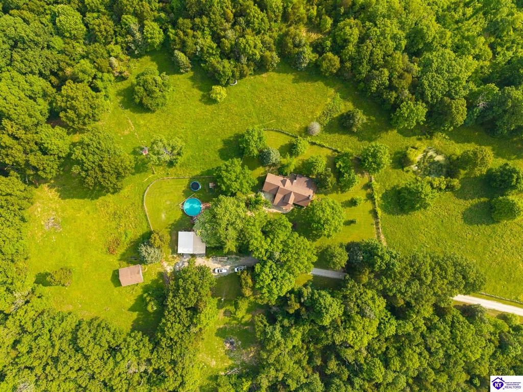 Experience refined country living at 410 Cedar Flat Road - your secluded 36.84-acre estate in the heart of Meade County. Surrounded by rolling farmland and mature trees, this property offers an unmatched blend of privacy, space, and sophistication just one hour from theLouisville International Airport and a short drive to Brandenburg or Elizabethtown. Built in 1986 and thoughtfully updated, this 3,677 sq.ft. residence features a flowing layout designed for comfort and entertaining. The main level welcomes you with a spacious kitchen offering generous counter space, a breakfast nook, and an adjoining dining area. The living room centers around a stunning stone fireplace, complemented by soaring ceilings and a wall of windows that invite in natural light. Just beyond, a climate-controlled sunroom frames panoramic views of your land - perfect for quiet mornings or evening relaxation. The main level also includes a bedroom and full bath, while the expansive primary suite upstairs provides a private retreat with a walk-in closet, en-suite bath, and enough room to unwind in comfort. An open loft overlooks the living room, ideal as a home office or reading area. The full finished walkout basement extends your living space with a second fireplace, a full bedroom and bath, a separate sleeping room, laundry area, and a large family room that opens to the outdoors. Outside, you'll find an above-ground pool, a spacious barn ready for livestock, and a separate shop building for projects or storage. A portion of the acreage is fenced, and the gravel driveway provides easy access through the property.Whether you envision a small farm, private trails, or simply a peaceful retreat surrounded by Kentucky countryside, 410 Cedar FlatRoad offers endless possibilities in a setting that feels worlds away yet remains close to everything.