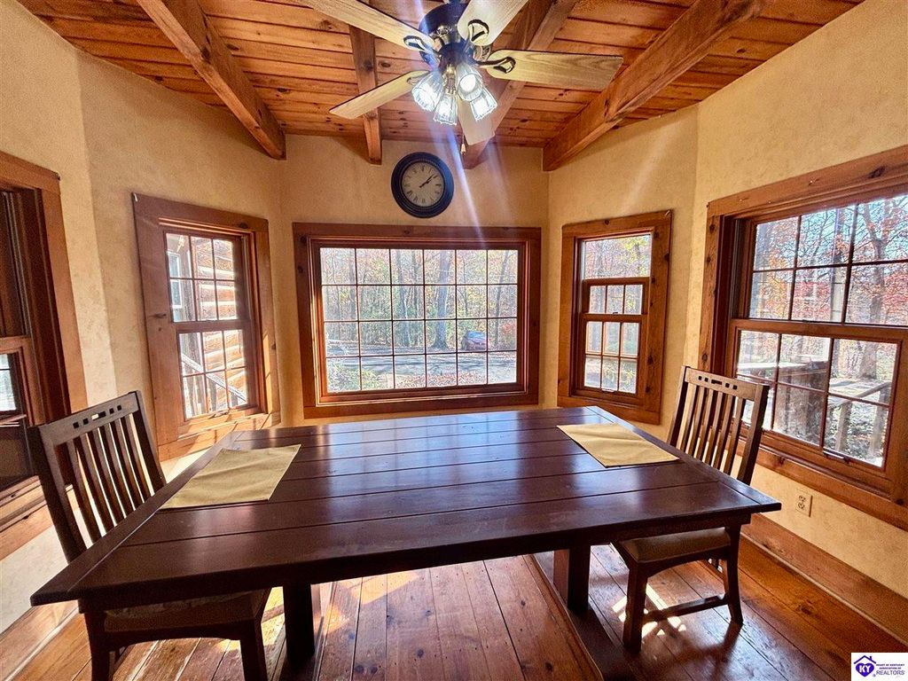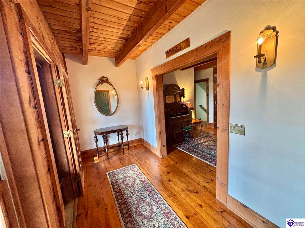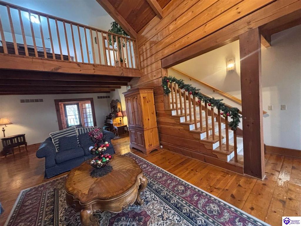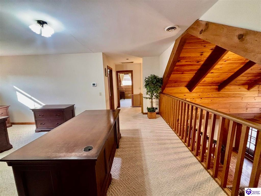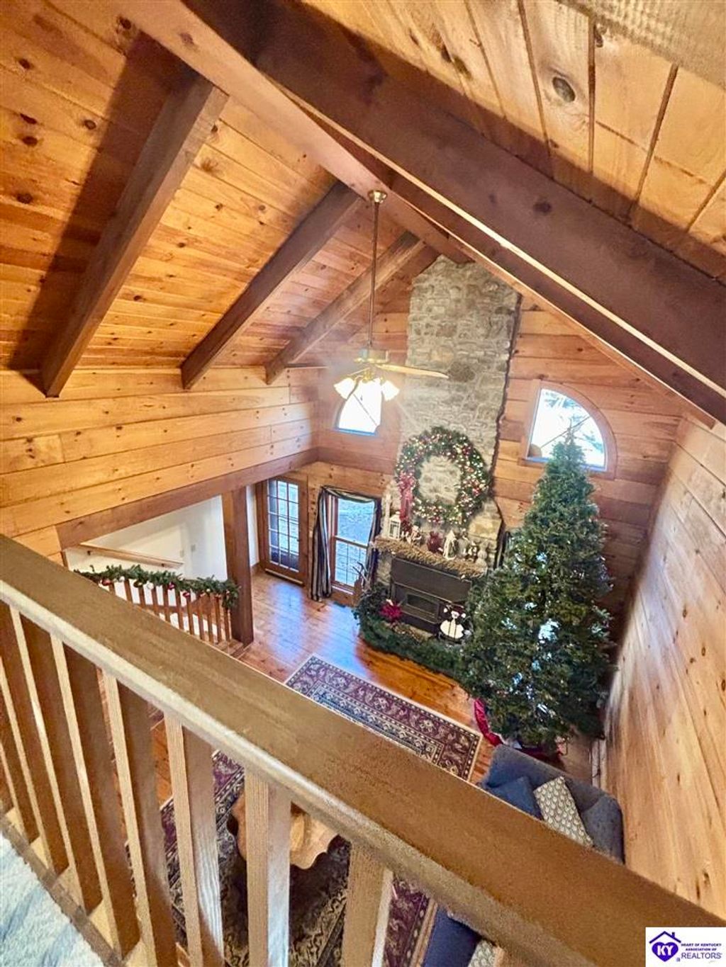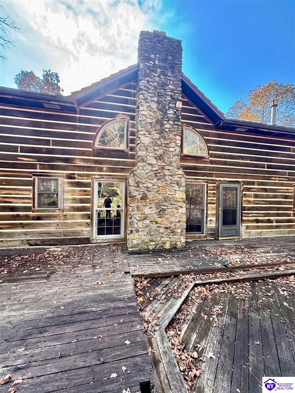 Pending-Sellers allowing back up offers.Gorgeous serene property set on 16 acres of picturesque land. This log home blends rustic charm with modern comforts, offering three bedrooms and endless character. At its heart is a stunningl stone with a wood-stove, soaring vaulted ceilings, and a spacious balcony that overlooks the open living areas below. Natural light pours in from expansive windows, highlighting the warmth of every hardwood surface.Follow the driveway over a creek through the trees to discover a storybook setting complete.The luxury of this expansive property offers unparalleled splendor. Upon arrival, the curb appeal of this stunning home, complete with a wraparound front porch, is truly breathtaking. The views are absolutely incredible. The two rocking chairs and swing are a lovely added touch. The kitchen features a breakfast nook with beautiful beams and woodwork, complementing the kitchen perfectly. The primary suite, conveniently located on thon the main floor, boasts two spacious walk-in closets and a luxurious primary bathroom, complete with a relaxing tub area, woodwork, two vanities, and a shower area. Additionally, the primary suite offers private access to the deck, ideal for enjoying a good book or morning coffee. Upstairs, the overlook of the beautiful den area features vaulted ceilings and a central office area, perfect for Two generously sized bedrooms upstairs each have walk-in closets, a significant advantage, and share Rustic Elegance meets modern comfort! Two generously sized bedrooms have walk-in closets upstairs, a significant advantage, a full-size bathroom. The basement boasts an open family room/game room area with a beautiful stone fireplace and access to the outdoors. Two additional rooms in the basement can be utilized as bedrooms or exercise rooms, offering endless possibilities. The ping-pong table and air hockey table in the basement are a bonus. The views from the back of the property are truly amazing, and the expansive deck is perfect for entertaining and relaxation, offering endless possibilities for your own retreat. Furthermore, a warm inviting atmosphere! truly amazing, and the expansive deck is perfect for entertaining and relaxation, offering endless possibilities for your own retreat. a huge bonus room area above the three-car garage awaits completion, providing additional providing opportunity for bonus room.