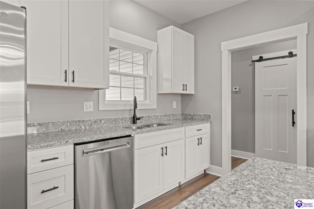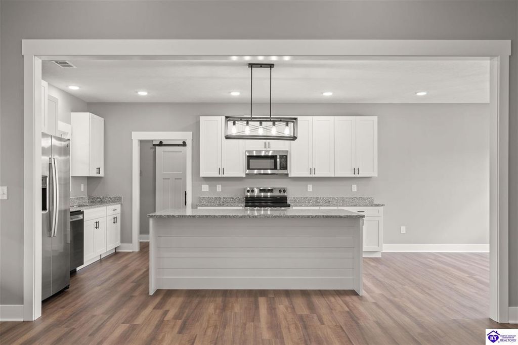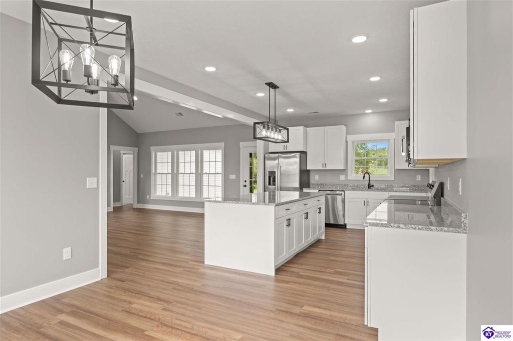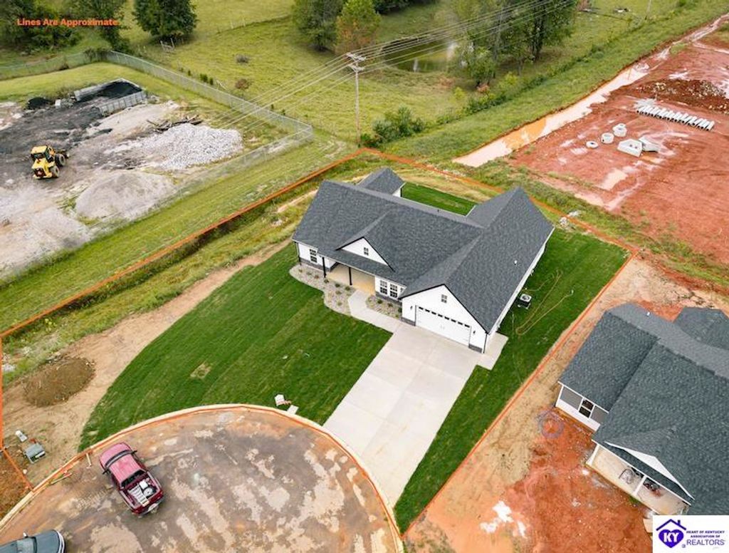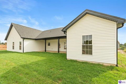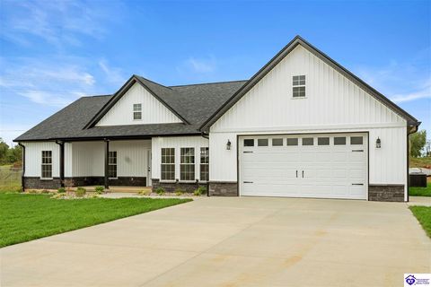 Welcome to 88 Betty Boyd Lane - where single-level luxury meets effortless design in the heart of Brandenburg. This brand-new 4-bedroom, 2-bath home spans nearly 2,000 square feet of thoughtful living space, blending open-concept flow with timeless style. Step inside to a bright, vaulted-ceiling great room anchored by an oversized island that brings everyone together. The chef's kitchen features granite countertops, stainless steel appliances, crisp white cabinetry, and a walk-in pantry with a barn door that adds a touch of modern farmhouse charm. Cozy up beside the sleek electric fireplace on cooler evenings, or let natural light pour through the large front windows as you enjoy morning coffee. The spacious primary suite offers a private retreat with a double-vanity bath, tiled walk-in shower, soaking tub, and generous closet space. Three additional bedrooms provide flexibility for guests, an office, or hobbies - all centered around comfortable, easy living. Built with care and efficiency in mind, this home includes a **concrete storm shelter built inside the home** for peace of mind during severe weather, plus a tankless water heater and energy-efficient windows for year-round comfort. Outside, enjoy covered front and rear porches that invite you to relax or entertain throughout the seasons. The .38-acre lot offers ample green space, complemented by a concrete drive and walkway for low-maintenance curb appeal. Tasteful stone accents elevate the exterior, while the attached two-car garage adds everyday convenience. Located in a desirable Brandenburg neighborhood, this home is close to shopping, dining, and recreation - just 0.9 mi to Brandenburg Riverfront Park, 0.8 mi to Meade County Public Library, 0.9 mi to David T. Wilson Elementary, 0.7 mi to The Daily Grind coffee shop, and 0.9 mi to Kroger in River Ridge Plaza. Stay active at Taylor Fitness or Meade Activity Center, both less than 2 miles away. Designed for comfort, safety, and style, 88 Betty Boyd Lane offers modern living at its finest.